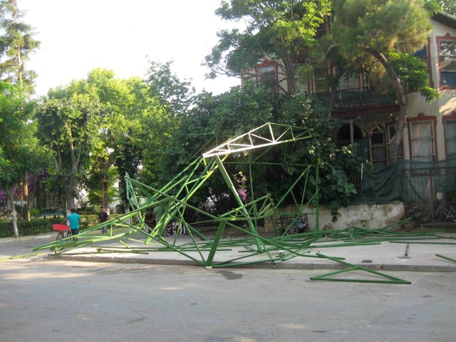 Tenteyi ise İBB tamamen sökülebilir şekilde çivata bağlantılı olarak yaptı. Artık herşey hazırdı. İki gün sonra açılış konseri yapılabilirdi. Ancak ertesi gün sabahın erken saatlerinde Adalar Belediyesi bir iş makinasıyla bir gün önce yapılan konstrüksiyonu yıktı. Malzemelerin bir kısmını götürdü. Kalanını ise halkın hücum etmesi üzerine bıraktı. Ertesi gün kalan malzemeyi İBB ekipleri kesip biçerek, kaynatarak tekrar yerine dikti ancak ölçüler değişmişti. Yine de bir kaç saat sonra yapılacak konsere yetiştirdiler. Akşam İBB Kent Orkestrası’nın Türk Müziği Bölümü çok beğenilen bir konser verdi. Konsere Adalar Kaymakamı, İBB Kültür Daire Başkanı, Adalı STK’ların yöneticileri ve Adalılar katıldı. Bu konserle alana direkt müdahale bitti ancak çöp konteynırlarının konulması, Adalar’a giren kamyonların akşam park etmesi gibi tatsızlıklar sürdü. Bir ara Adalar Belediyesi, Derneğin önündeki kaldırımı kazmaya kalktı ama halkın yoğun protestosu sonucunda vazgeçti.