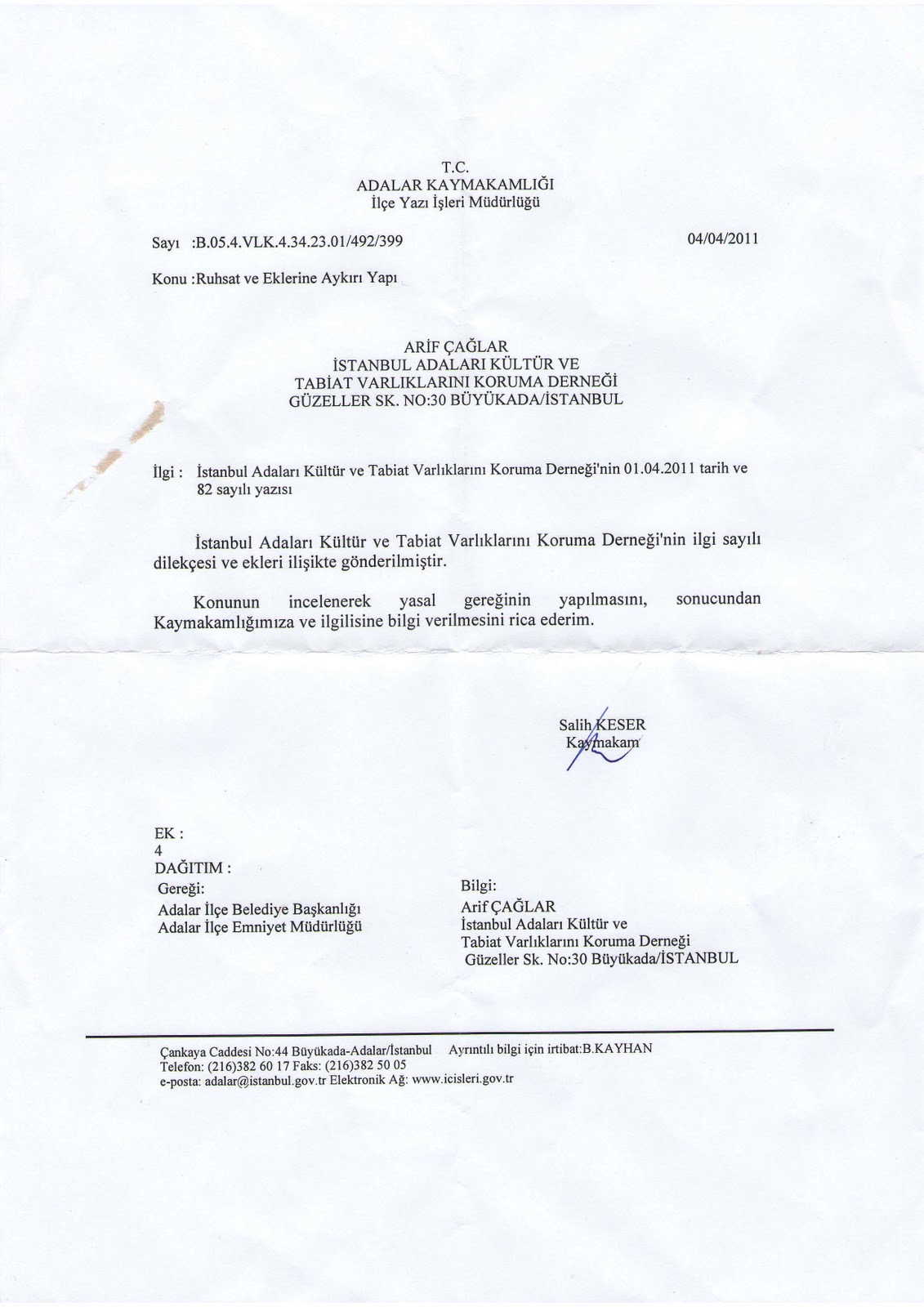 Yanıtınız, bilgileriniz ve yardımlarınız için size minnettarız. Çok tesekkür ederiz. Tavsiyelerinize uyup en yakın zamanda Aya Nikola Kilisesi Mütevelli Heyeti Başkanı Andrea Bey ya da başkan yardımcısı Olimbia Hanım’la temasa geçeceğiz.