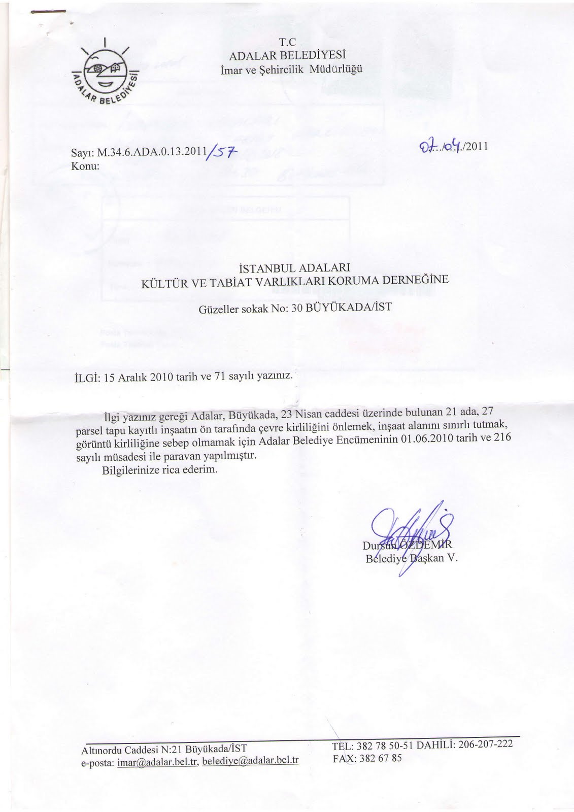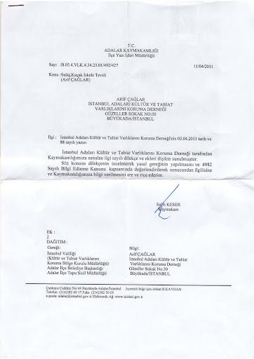 Yukarıda kadastral adresi çıkarılmış yer için verilmiş bir izin belgesi var ise bilgisinin 4982 sayılı Bilgi Edinme Hakkı Kanunu’na istinaden kanuni süresi içinde İstanbul Adaları Kültür ve Tabiat Varlıklarını Koruma Derneği’ne verilmesini; böyle bir izin yoksa bu yer hakkında kanuni işlem başlatılarak bu husus hakkında bilgilendirilmemiz hususunu emir ve müsaadelerinize saygılarımızla arz ederiz.
