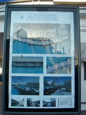 Yapı ve Kredi Bankası köşesindeki panoda teşhir etmişler! Sanki Münih Olimpiyat Oyunları Köyü mimarisi!… Ne lokantaları tamamlar nitelikte ne de Ada dokusuna uygun!… Yani yine “altı kaval üstü şişhane” durumlarıyla karşı karşıyayız!