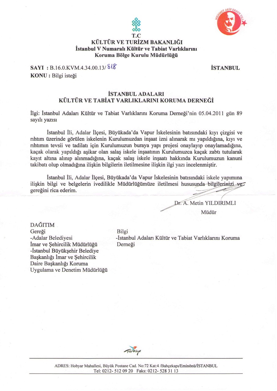 Dört başlık altında sorduğumuz bilgilerin 4982 sayılı Bilgi Edinme Hakkı Kanunu amir hükümlerine istinaden İstanbul Adaları Kültür ve Tabiat Varlıklarını Koruma Derneği’ne verilmesini saygılarımızla arz ve taleb ederiz.