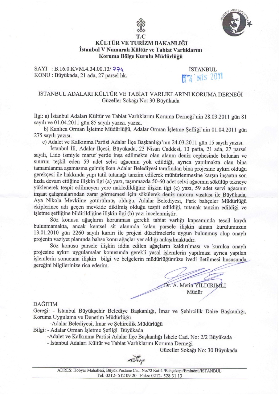 Büyükada sahilinde (23 Nisan Caddesi, 21 ada, 27 parsel de) Lido ismiyle maruf yerde inşa edilmekte olan muvazaalı yapı, deniz cephesinde bulunan ve arsalarının sınırını teşkil eden 59 adet selvi ağacını yok etmiştir.