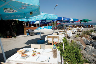 Kıyı’ya gitmek için vapur iskelesinden çıkınca sola dönün ve yolun sonuna gelene kadar yürüyün. Rakipleri manzaralı teraslarını inşa ededursunlar, Kıyı, deniz kenarında kurulmuş yedi-sekiz şemsiyeli masasıyla gayet salaş ve alçakgönüllü. Kıyı’nın farkı mutfağında. Son derece geniş mönüye, lokantanın sahibi Adnan beyin yetiştirdiği yeşilliklerden yapılan salatayla başlamanızı tavsiye ediyoruz. Sarmısaklı ve zeytinyağlı deniz börülcesi de muhteşem. Ara sıcaklardan Rum böreğini ilk kez Kıyı’da tadıyoruz ve bayılıyoruz: Kızartılmış ince bir patlıcan dilimi üzerinde lor peyniri ve dereotu. Lokantanın günlük balık mönüsü de hayli geniş. Biz gittiğimizde listede her yerde bulabileceğiniz levrek ve istavritin yanı sıra mercan, kırlangıç ve dülger de vardı. Burada genelde ızgara tercih edilse de kızarmış barbunyadan vazgeçemiyoruz. Ne yazık ki Kıyı’nın çok hesaplı olduğunu söyleyemeyeceğiz, çoğu balık 20 lira civarında. Ama iskelenin yanındaki lokantalardan daha pahalı olmadığı kesin.