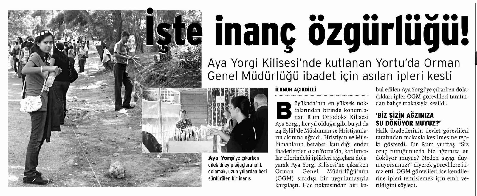 24 Eylül 2011 Cumartesi günü Büyükada Aya Yorgi Kilisesi’nde kutlanan Azize Tekla Yortusu’na katılanların, Aya Yorgi Rum Ortodoks Kilisesi Yönetimi’nin yazılı [Ek-1], Adalar Orman İşletme Şefliği’nin ise sözlü uyarılarına rağmen nedeni-niçini kendinden menkul ve meçhul bir biçimde yol boyunca sözümona “ibadet (!?) için” gerdikleri —çevre kirliliği yanı sıra kuşların da takılarak telefine neden olan adeta tuzak mahiyetindeki— ipliklerin [Ek-2], yangın emniyet yolunu da kapatması nedeniyle Orman Genel Müdürlüğü çalışanlarınca kesilmek suretiyle kaldırılmasına dair ?.9.2011 tarihli BirGün Gazetesi’nde İlknur Açıkdilli imzasıyla yayımlanan “İşte inanç özgürlüğü!” başlıklı yazıda [Ek-3] geçen, “Halk ibadetlerinin devlet görevlileri tarafından makasla kesilmesine tepki gösterdi,” cümlesi dahi aslen asılsız bu iddiayı tamamiyle hükümsüz kılmaktadır zira “ibadet: bir dinin buyruklarını yerine getirmek,” anlamındadır ki bir Hıristiyan-Ortodoks yortusu olan Azize Tekla Günü’nde Büyükada Aya Yorgi Kilisesi Yönetimi’nin, “batıl ve boş inançlar” olarak niteleyerek men ettiği bu ve benzer batıl itikatlerin neye ve niçin hizmet ettiği meçhul çarpıtılmış yalan yanlış bir haberle teşvik edilmesi yerine bu akıllara ziyan nafile sözde “ibadet”in manasızlığının gereğince ifade edilmesi suretiyle gerçekte sorumlu ve etik bir gazetecilik örneği verilebilirdi, verilmeliydi. Adalar Orman İşletme Şefliği çalışanlarının o anda, doğaçlama, doğayı korumak adına halkın eğitimine de yönelik yapmış oldukları her manada yerinde bu uygulamanın yerilmesi yerine takdir edilmesi gerektiği kanaatindeyiz.