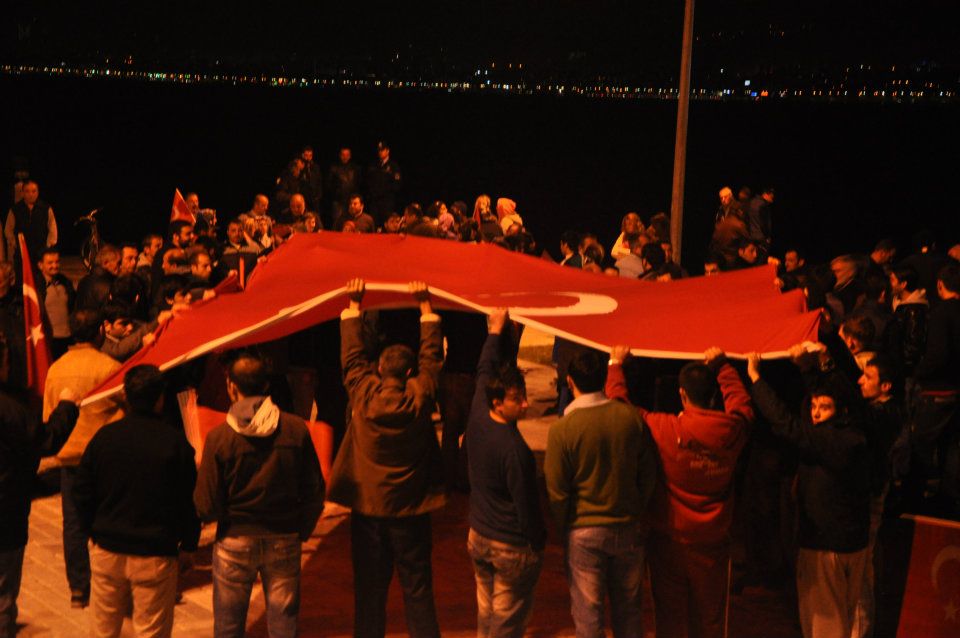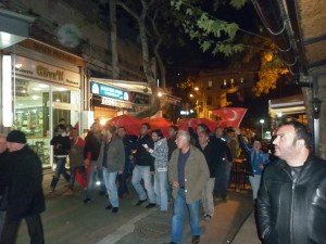 Büyükada’da kendiliğinden gelişen protesto yürüyüşü, kulaktan kulağa yayılarak organize edildi. “Akşam 19:00’da Lido önünde buluşacağız,” diye birbirini arayan bir grup, bu saatte bayraklarıyla Mavi Marmara vapur iskelesi önünde buluştu. Küçük kız çocukları da Türk bayraklarıyla gruba katıldı. Yürüyüş sırasında yol kenarındaki bazı kişilerin grubu destek için alkışladığı görüldü.