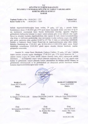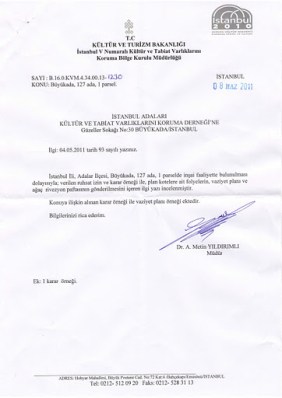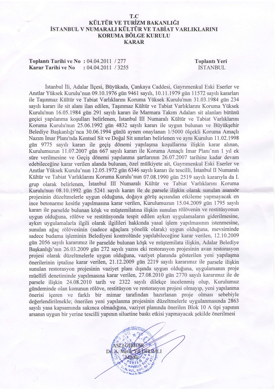 İstanbul İli, Adalar İlçesi, Nizam Mahallesi, Nizam Cad., 29 pafta, 127 ada, 1 parsel sayılı yerde; Kurulunuzun 04.04.2011 tarih 3255 sayılı kararına göre, uygun görülmediği için izin verilmediği anlaşılan yapılaşmanın, Adalar Belediyesi nezdi ve nezaretindeki inkişafının ibret verici fotoğraflarını kurulunuzun dikkatlerine tevdi ediyoruz. 1. gurup eski eser binanın koruma alanı ve yeşil korusunu teşkil eden arazinin topografyasını değiştirerek, korunması gerekli olan tabiatı ve tabii halini tahrip ve tadil eden bu eylemin bir inşaat ruhsatnamesi ile yapılamayacağı aşikârdır. Arazi ile bütünlüğü olan yanmış 1. gurup tarihi köşk ile doğal çevresinin korunması ve bu korumanın fiilen gerçekleştirilmeden diğer inşai imkânlara cevaz verilmemesi icab ederken koruma usul ve esaslarına aykırı olarak koruma alanının talan ve tahribine göz yumulmaktadır. Arazide öncelikli olarak yapılması gerekli olan işin; yanmış, ancak restitüsyon ve restorasyon projeleri onaylanmış ahşap köşk ile çevresinin imarı olmalıydı. Plân ve projelendirme sırası da bunu göstermektedir. Korunmasında söz ve selâhiyet sahibi olduğunuz değerlerin Adalar Belediyesi marifetiyle yok edilmesine seyirci kalamayacağımız bir durumla karşı karşıya kalınmıştır. Derneğimizin amaçları doğrultusunda bu tür uygun olmayan davranışların da yakın takipçisiyiz. Bu itibarla, kaçak yapılara müdahale ve kanuni muamelâtın başlatılması hususunu saygılarımızla bilgilerinize arz ederiz.