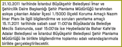 Deprem nedeniyle çok çalışmakta oldukları, bilahare başka bir tarihte gelebilecekleri söylendi, Adalar Belediye Başkanı Mustafa Farsakoğlu tarafından. Oysa itiraz edilecek konular için planların askıdan iniş tarihi (21.11.2011) çok önemliydi ve bu tarih kaçırıldığında bilgilendirilmenin de bir manası yoktu!