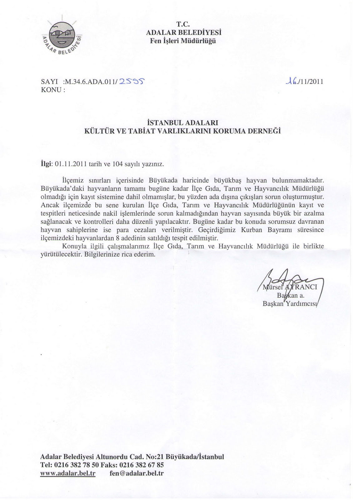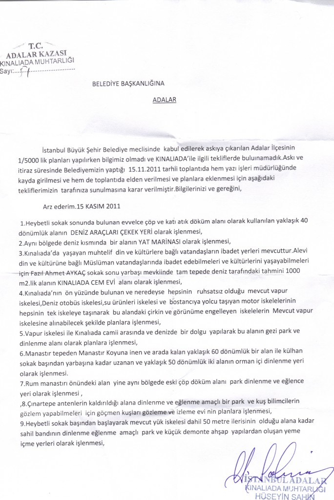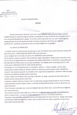 3- 16.06.2011 günlü İstanbul Büyükşehir Belediye Meclisi’nde görüşülerek kabul edilip 21.10.2011 tarihinde askıya çıkarılan Adalar 1/5000’lik Koruma Amaçlı Nazım İmar Planları 21.11.2011 günü askıdan indirilecek! Müslüm Gürses: “İtirazım var!…” dedi… Peki ya Adalılar’ın itirazı yok mu? Var!… İstanbul Adaları Kültür ve Tabiat Varlıklarını Koruma Derneği: İstanbul Büyükşehir Belediye Meclisi’nin 16.06.2011 tarih ve 1344 sayılı kararıyla İstanbul Büyükşehir Belediyesi tarafından 21 Eylül 2011 tarihinde İstanbul Büyük Şehir Belediye Başkanlığı tarafından onaylanarak 21 Ekim 2011 tarihinde askıya çıkarılan İstanbul Adalar İlçesi için hazırlanmış “1/5000 Ölçekli Adalar Koruma Amaçlı Nazım İmar Planı”na itiraz dilekçemizdir (toplam 5 sayfadır).