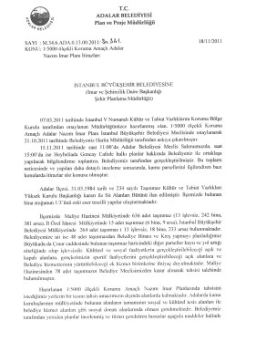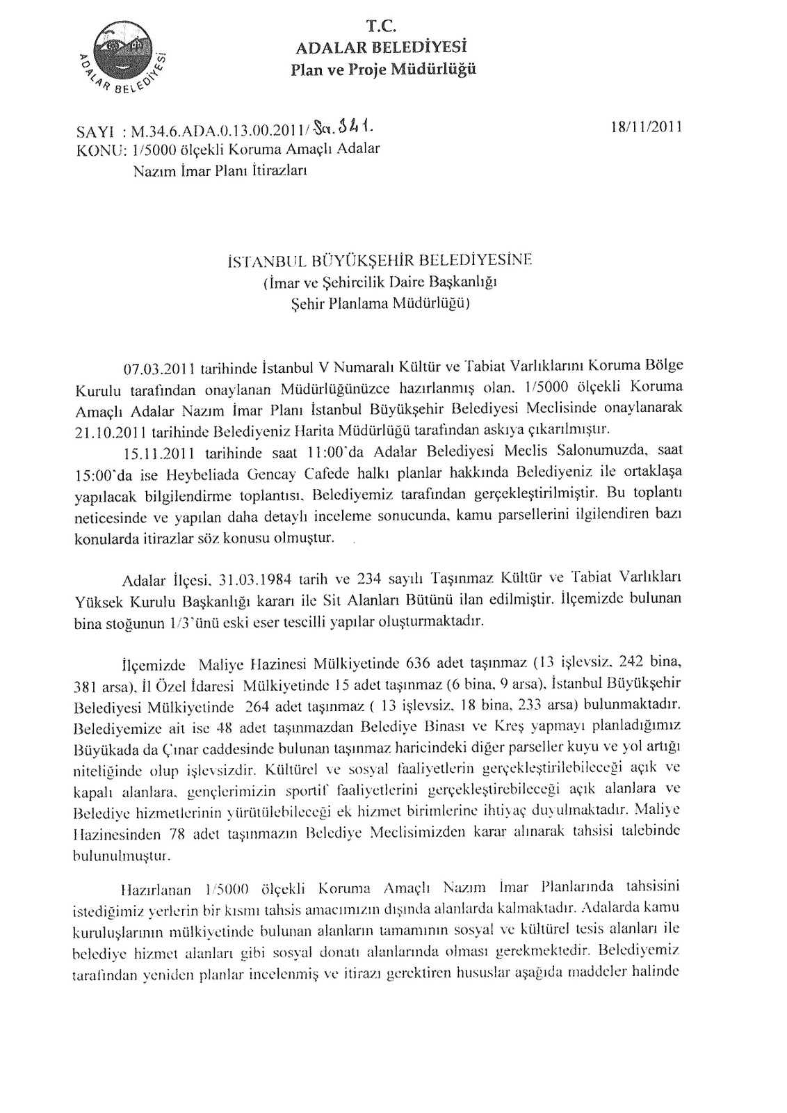KONU : İstanbul Büyükşehir Belediye Meclisi’nin 16.06.2011 tarih ve 1344 sayılı kararı 21.09.2011 tarihinde İstanbul Büyükşehir Belediye Başkanlığı’nca onaylanarak 21.10.2011 tarihinde askıya çıkarılan 1/5000 ölçekli Adalar Koruma Amaçlı Nazım İmar Planı’na itirazımız hakkında.