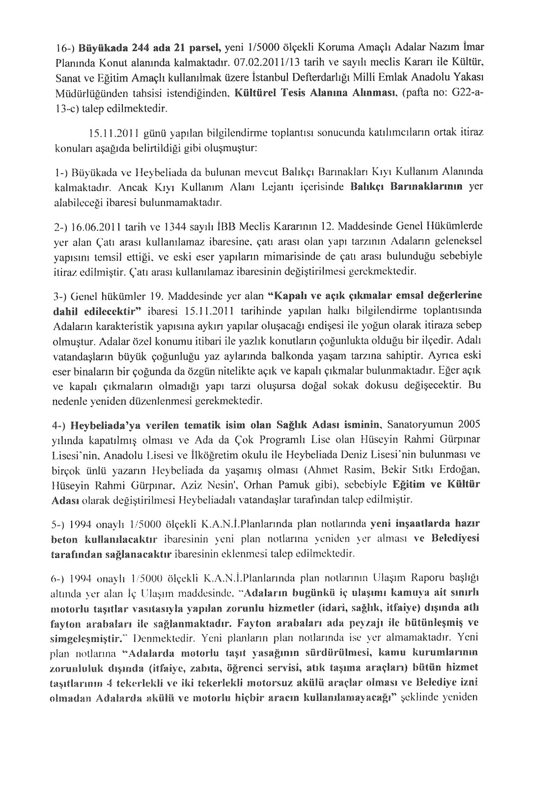 İstanbul Büyükşehir Belediye Meclisi’nin 16.06.2011 tarih ve 1344 sayılı kararı 21.09.2011 tarihinde İstanbul Büyükşehir Belediye Başkanlığı’nca onaylanarak 21.10.2011 tarihinde askıya çıkarılan 1/5000 ölçekli Adalar Koruma Amaçlı Nazım İmar Planı’na itirazlarımız ekte sunulmuş olup tüm Adalılar’ın bilgisine sunulur.