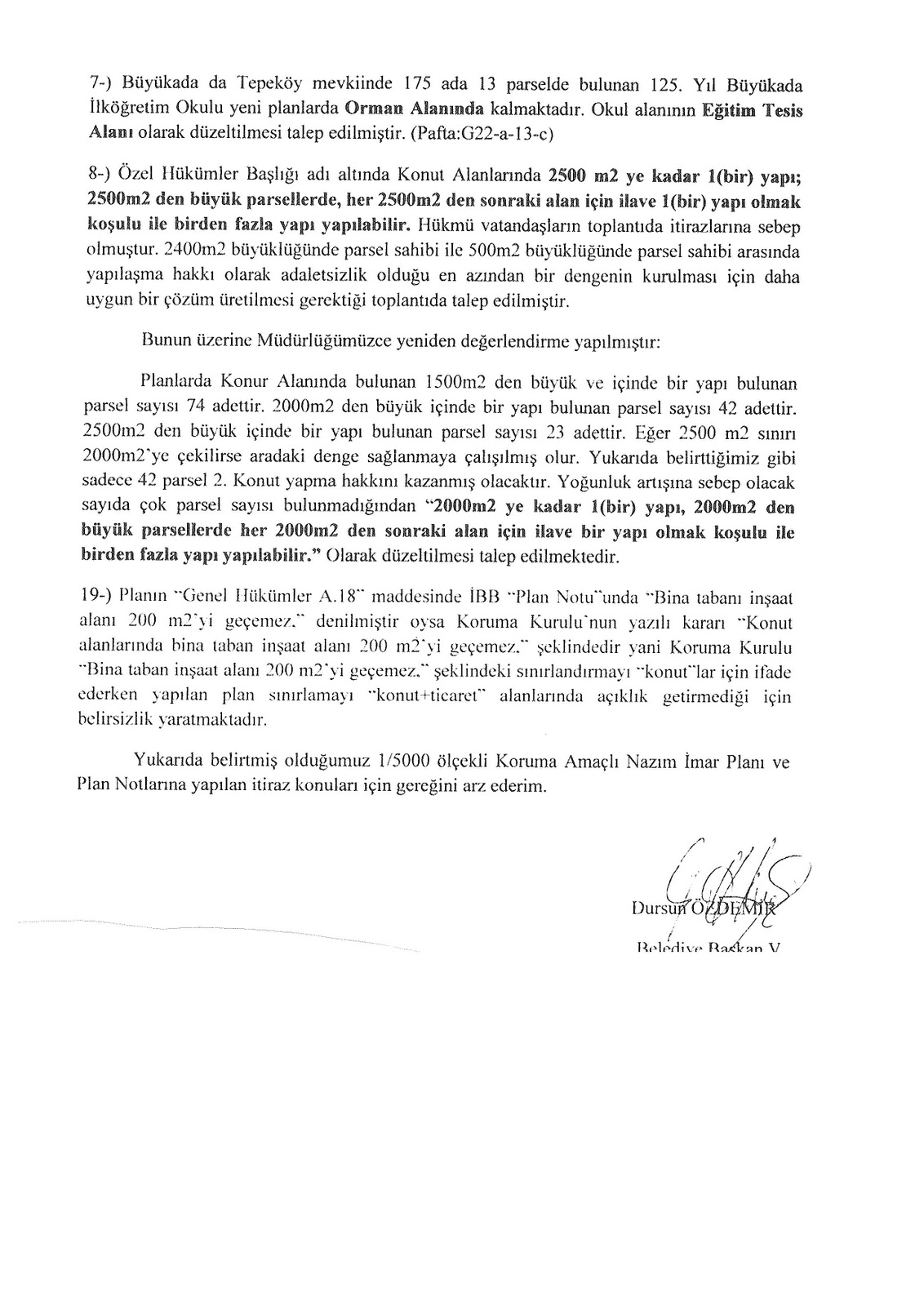 Yukarıdaki açıklamalarımız çerçevesinde, yasal mevzuata, planlama ilke ve esaslarına aykırı düzenlemeler barındırdığı tespit edilen 1/5000 ölçekli Adalar İlçesi Koruma Amaçlı Nazım İmar Planı’na diğer yasal haklarımız saklı kalmak koşuluyla itirazımızı vekâleten saygılarımızla sunarız.