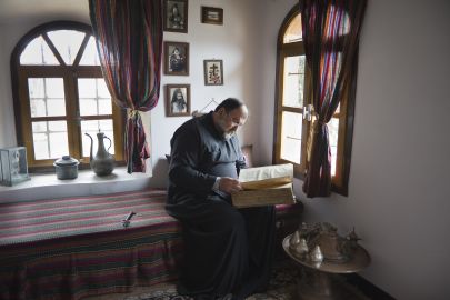 Dans le monastère de Saint-Georges, sur Heybeliada, le rôle de gardien du temple est tenu par l’archidiacre Nectarios Selalmazidis. L’édifice a été construit il y a mille ans, et plusieurs fois rebâti au gré des tremblements de terre et des incendies successifs. Les derniers moines sont partis au début du siècle dernier. “Le monastère était quasiment vide quand je suis arrivé, il y a sept ans. J’ai alors commencé à restaurer et à acheter des meubles et des objets anciens”, se souvient l’archidiacre. Avec la patience du collectionneur, il a donné des allures de musée à ce monastère déserté. Dans les enfilades de pièces, des poêles, des services à thé et des coffres de l’époque ottomane voisinent avec les photos en noir et blanc des anciens patriarches, et une précieuse relique, la robe d’ordination de Nicodème, patriarche de Jérusalem à la fin du XIXe siècle.
