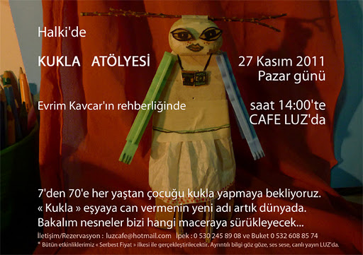 3- LUZ Cafe: “27 Kasım 2011 Pazar günü saat 14:00’te, tabii ki LUZ’da, birlikte kendi dünyalarımızı yaratmaya başlayacağız. 7’den 70’e her yaştan çocuğu kukla yapmaya bekliyoruz…”