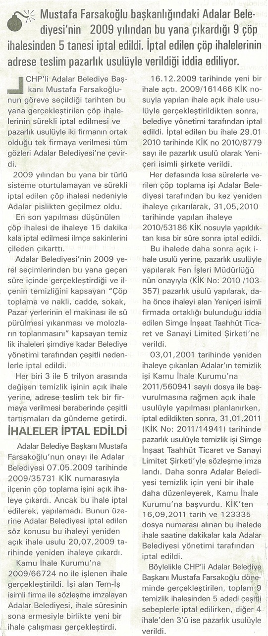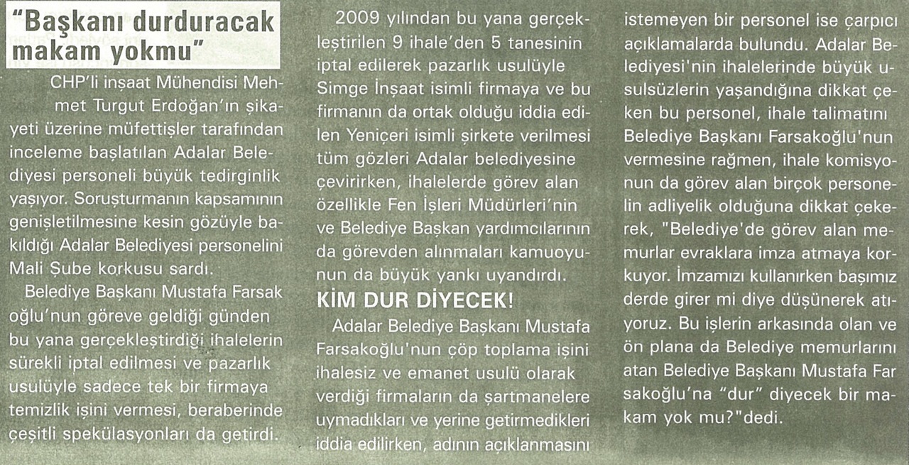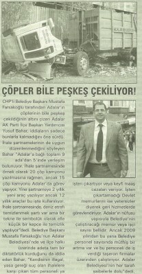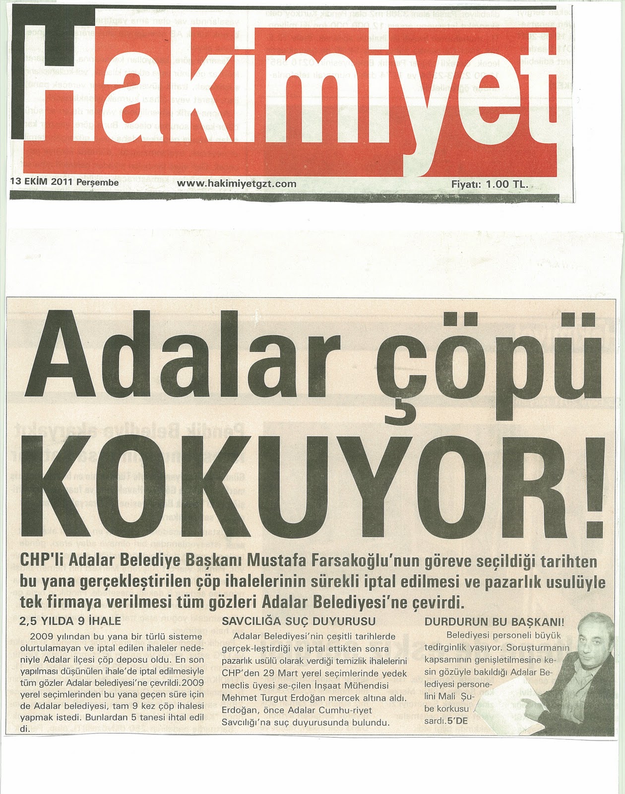 Adalar Belediyesi zabıtaları geliyorlar ve “Hakkınızda şikâyet var, ceza yazacağız,” diyorlar. Nedir şikâyet? Çöpleri dışarı atmışız!… Belediye’nin sayın zabıta yetkilileri şikâyet var palavrasını bir daha ne söyleyin ne de ağzınıza alın!… “Şikâyeti kim yaptı,” diye sorulduğunda; “Bize öyle iletildi,” bahaneleriyle kaçmayın… Harbi harbi şu kişi şikâyet etti diyemiyorsanız yalan söylüyorsunuz demektir. Şikâyet eden ortaya çıkmıyorsa öyle birisi yoktur deriz.