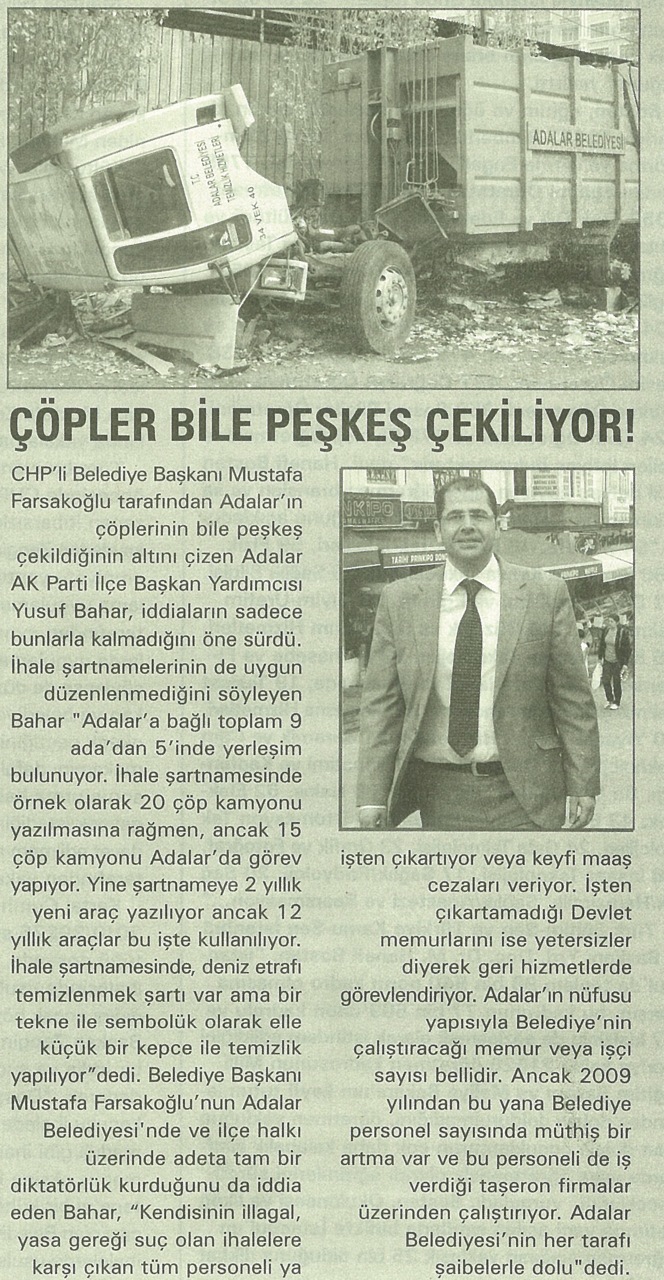 Bu kadar çok temizlik merakınız varsa alın size şikâyet ediyorum. Faytonların bıraktığı at pisliklerini toplatın veya ceza yazın. Arabacılara, “Hakkınızda şikâyet var size ceza yazacağız,” diyecek cesaretli bir zabıta yetkilisini görmek istiyorum. Bunu yaptığı an gidip elini öperim. Arabacının söyleyeceği ifadeyi duyar gibiyim. “At, lâf anlamıyor ben ne yapayım,” diyecektir. Ağaçlara, yapraklarınızı sakın yere atmayın diyemiyorum… Bir başka şikâyet deniz kenarındaki poşetler, İskele yanındaki eski yıllanmış bisikletler (Adalarımıza sembol olan bu bisikletlere misal park yerleri yapmayı, bunu düşünün), oturma banklarının etrafında çöpler o kadar çok ki anlatmakla bitmez… Çarşı içinde olur olmadık yerlerden akan pis sular. Neden esnafa bu kapının önünü temizleyeceksen sularının giderini düşün diyemiyorsunuz?… Veya Belediye olarak yol yapılırken pis suların gideceğini neden hesaplamıyorsunuz? Daha önce yapılmamış demeyin yapın veya yaptırın… Ki bizler şikâyet etmeyelim… Yetkiliniz kimse, bir gün çöp toplayan arabanın arkasından gidip baksın. Lokantaların çöplerinden akan yağlı sularının bıraktığı yerlerden geçerken ayağımız kayıp düşüyoruz… Pis kokular yayılıyor etrafa… Bu pisliği kim kontrol ediyor?… Bunları yazmakla bitmez…