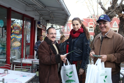 Toplantı, bu kampanyaya ve Adalar’da yürütülen çevre çalışmalarına sunduğu katkılar nedeniyle Adalar Belediyesi Çevre Mühendisi Merve Kulbakan’a ayrıca teşekkür edilerek ve Adalılar’ın sorularına cevap verilerek bitirildi. Toplantıdan sonra Heybeliada Vefa Şehitleri, Ayyıldız Caddesi ve İskele Meydanı’nda bilinçlendirme faaliyetine başlandı. Adalılar’a doğaya zarar vermeyen bez çantalar ve naylon poşetin zararlarının anlatıldığı broşürler dağıtıldı. Adalar Belediye Başkanı Dr. Mustafa Farsakoğlu, MBB Çevre Yönetim Merkezi Direktörü Aynur Acar, Nasuh Mahruki Başkanlığında AKUT Gönüllüleri, YUDOSK Çevre Gönüllüleri, TURMEPA Genel Müdürü Akşit Özkural ve manken Tuğçe Kazaz ile Adalılar vapurdan inen yolculara da naylon poşetin zararlarını anlatarak, broşür ve bez çanta verdiler. Heybeliada’dan Burgazada’ya geçen kalabalık grup burada da bilinçlendirme faaliyetini sürdürdü.