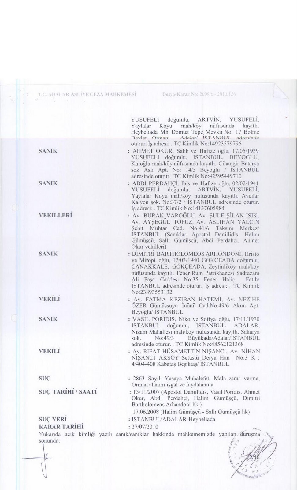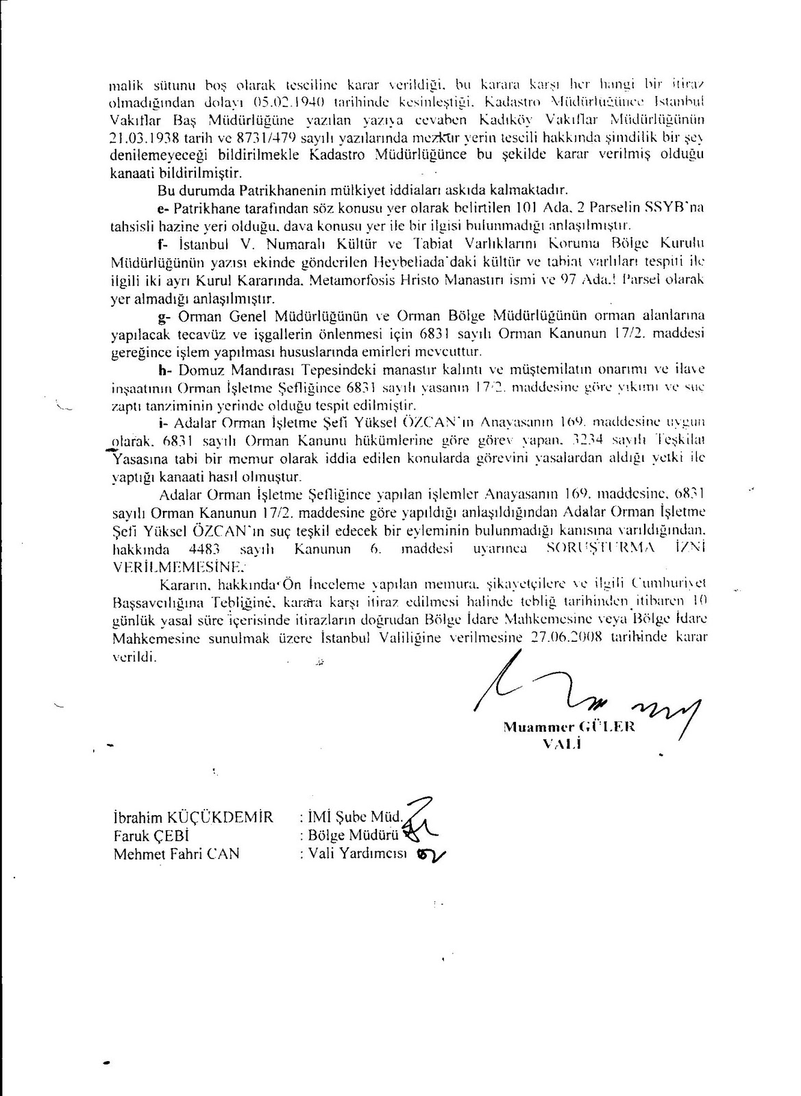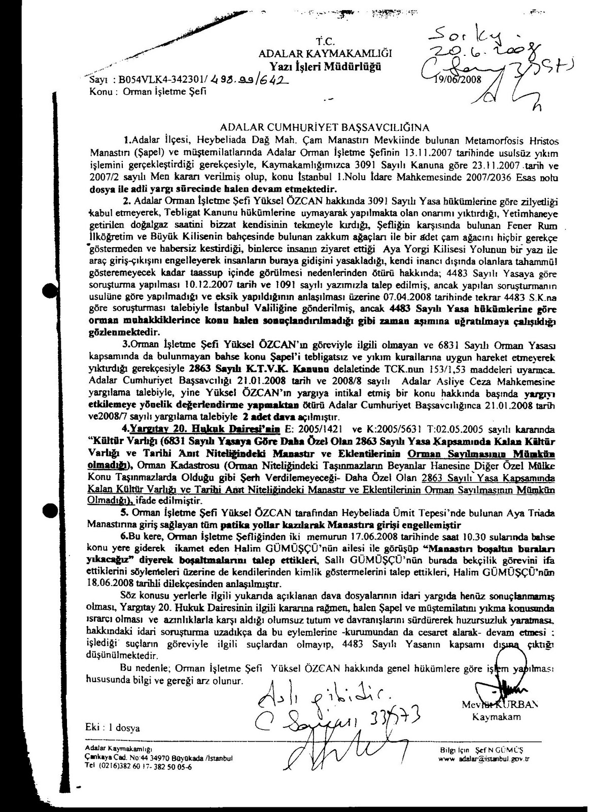 […] İnşaatı yıkan Adalar Orman Şefi Yüksel Özcan da “mala zarar vermek”ten 5 ay hapse mahkûm olurken, Patrik Dimitri Bartholomeos Arhondoni’ye herhangi bir ceza çıkmadı. […] Adalar Kaymakamı Mevlüt Kurban, ‘mal zilyetine’ tecavüz ettiği gerekçesiyle de Adalar Orman İşletme Şefi Yüksel Özcan’ın “orman alanına girmesini” engelleyen bir karar çıkarttı. […]