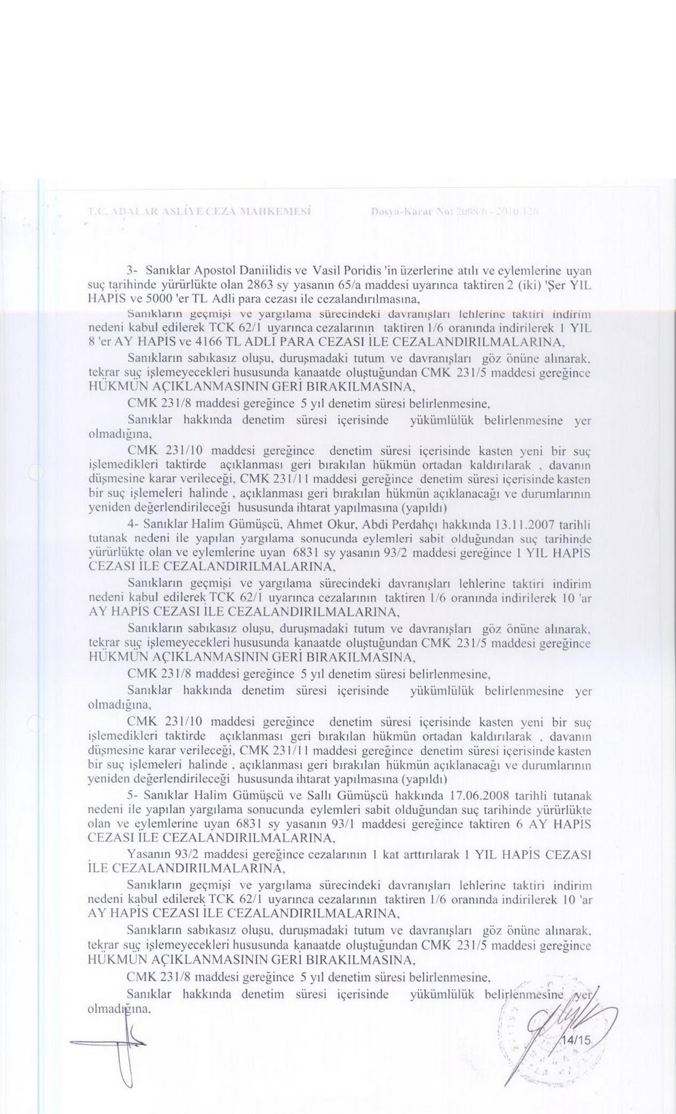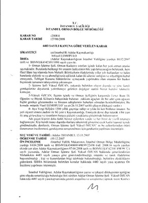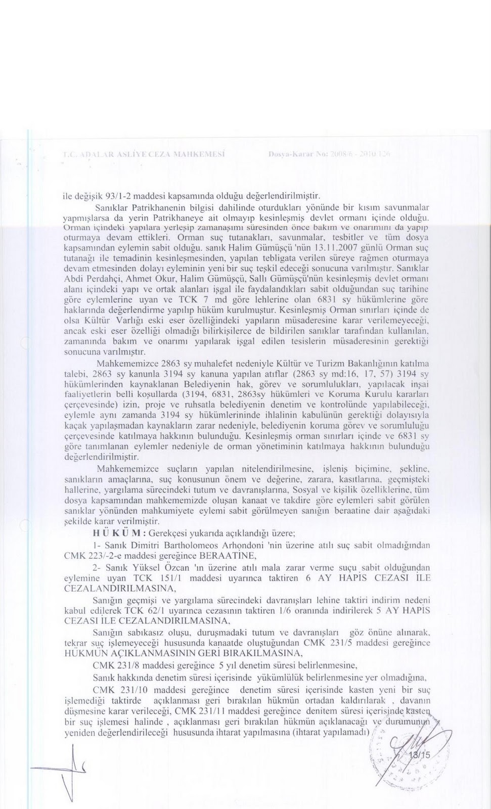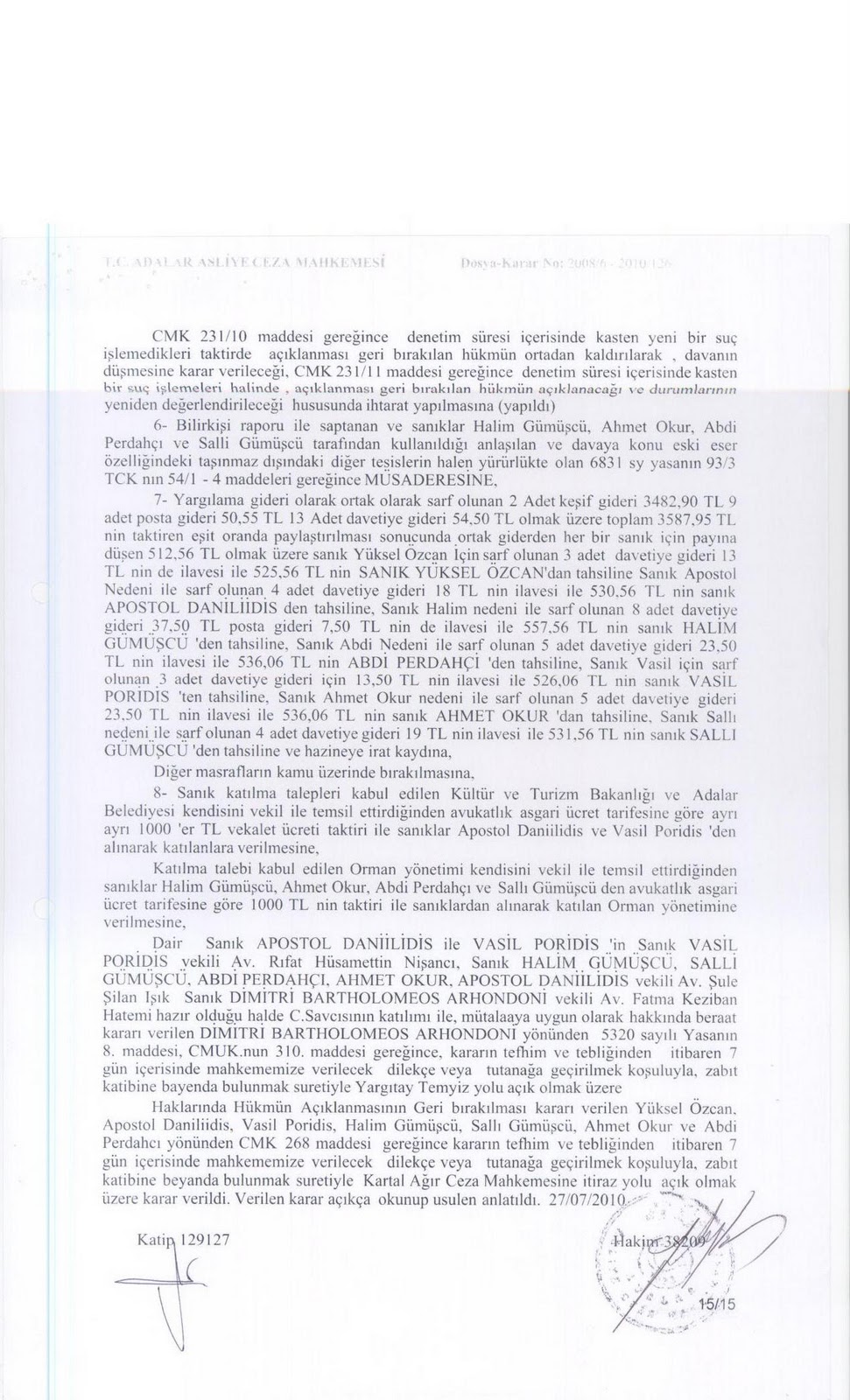 […] İnşaatı yıkan Adalar Orman Şefi Yüksel Özcan da “mala zarar vermek”ten 5 ay hapse mahkûm olurken, Patrik Dimitri Bartholomeos Arhondoni’ye herhangi bir ceza çıkmadı. […] Adalar Kaymakamı Mevlüt Kurban, ‘mal zilyetine’ tecavüz ettiği gerekçesiyle de Adalar Orman İşletme Şefi Yüksel Özcan’ın “orman alanına girmesini” engelleyen bir karar çıkarttı. […]