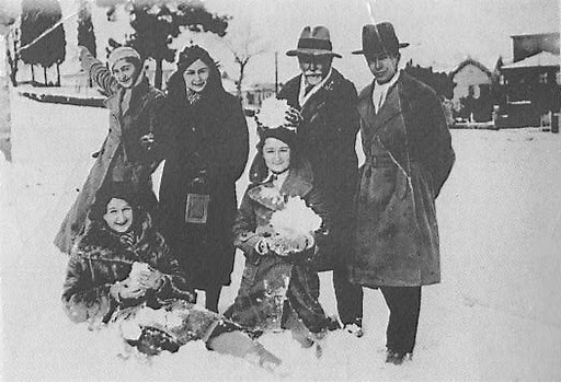 Sağdan sola: Teyzezâdem ve eniştem Dr. Kemal Önge, babam, küçük kardeşim Şahika Turan, küçük ablam Ayşe Önge, bendeniz, yerde oturan büyük ablam Nedret Atay (1930’lar)