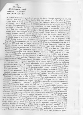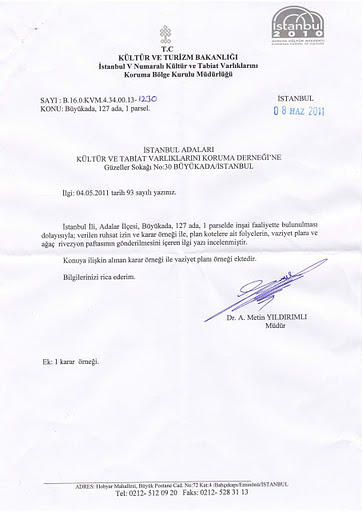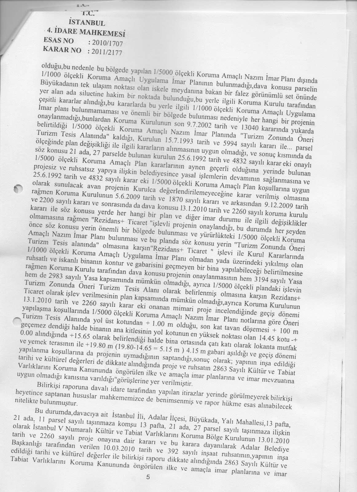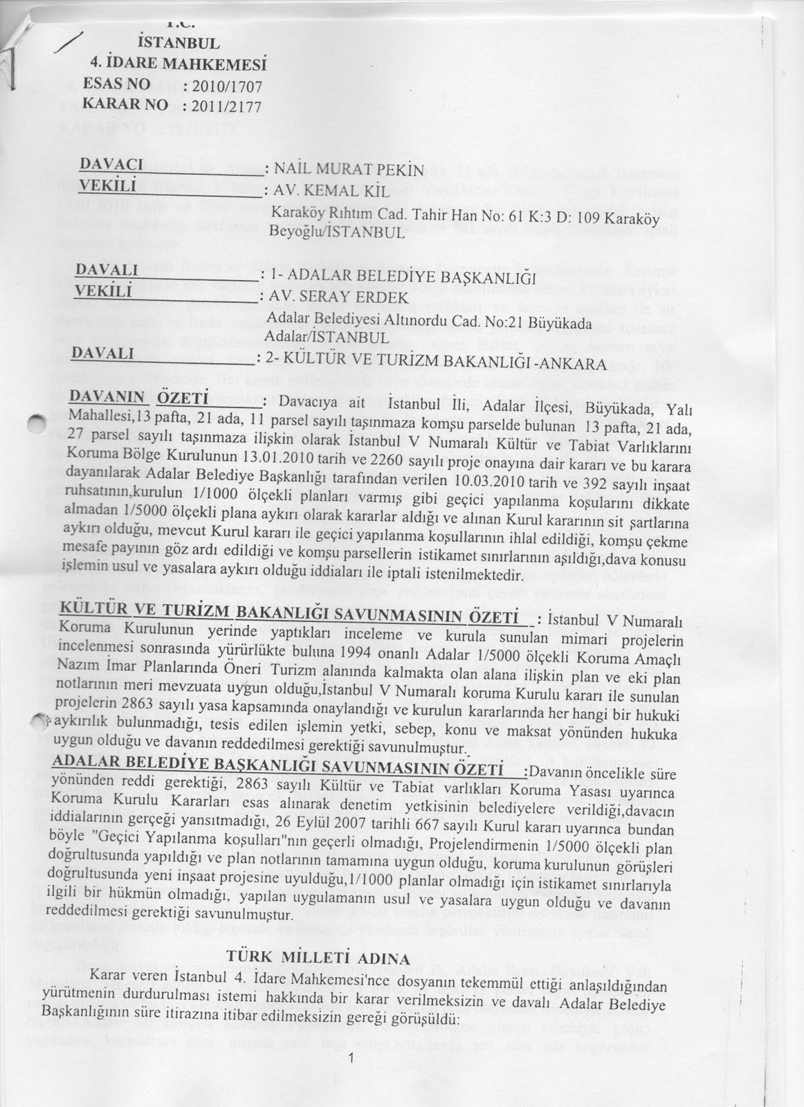 Bu soru önergesine cevap, Belediye Başkanı’ndan değil mahkemeden geldi. Projesinin, Meclis üyesi Aykut Mutlu tarafından hazırlandığı bizzat kendisi tarafından ifade edilen, Sn. Mustafa Farsakoğlu’nca Koruma Kurulu’nda görevlendirilmiş bulunan Eski Belediye Başkan yardımcısı Ayşen Eskici Özten tarafından Kurul nezdinde onaylanan projenin, meri 1/5000 ölçekli koruma amaçlı nazım imar planlarına aykırılığı nedeniyle Adalar Belediye Başkanlığı tarafından verilen 10.03.2010 tarih ve 392 sayılı inşaat ruhsatının mevzuata aykırı olduğuna dair TC İSTANBUL 4. İDARE MAHKEMESİ kararını bilgilerinize sunuyoruz.