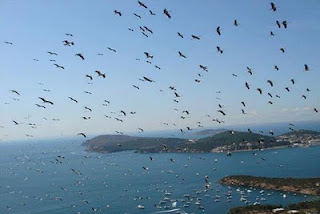 Sabah saat 11:00 civarında adalar üzerinde helezonik hareketler yaparak süzülmeye başlayan ilk 1000-1500’lük beyaz leylek grubu Kınalı-Burgaz-Heybeli’den geçip Dilburnu’na paralel devam edip Lunapark Meydanı’ndan Yetimhane’ye dik helezonik olarak yükselip Adakule-Sedef-Ayayorgi arasında 500m yükseliyor, bu yükseklikte İzmit yönündeki hava akımına kendini bırakarak akıp gidiyor. Bu leylek grubunun manzarasını herkesin görmesini isterdim.