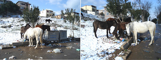31 Ocak 2012 tarihinde Büyükada Tepeköy Nevruzmevki Sokak’ta çektiğim fotoğraftaki tespitime göre: yazın, adamızın sembolü olan faytonlara koşulan cefakâr atlarımız, sahipleri arabacılar tarafından sezon sonunda başıboş ormana kaderlerine terk ediliyorlar. Kışın sert soğuk ve karlı olduğu bu günlerde, hayvanlar açlıktan çöp konteynırlarında atıklar arasında yiyecek bulmaya çalışıyorlar. Bu tip görüntülerde kedi ve köpeklerin olmasına alışmıştık ancak bu görüntü bana çok acı geldi… Geçmiş yıllarda adamızda böyle bir olaya hiç şahit olmamıştım… Hava karardığında belki barınacakları bir yer de yok sanırım… Aslında bu konuda gerçek duyarlılığı Belediye’nin göstermesi gerekir sanırım…