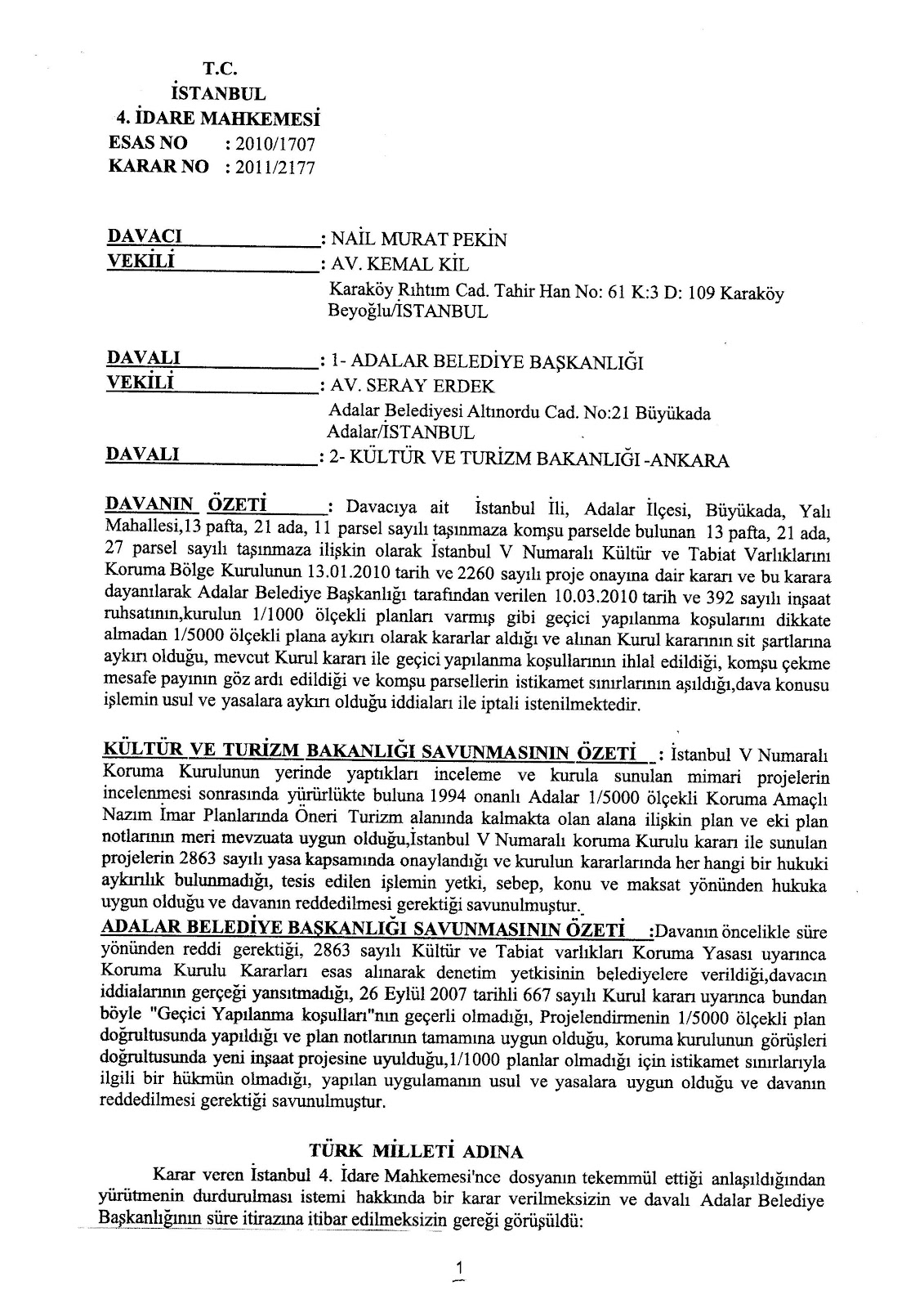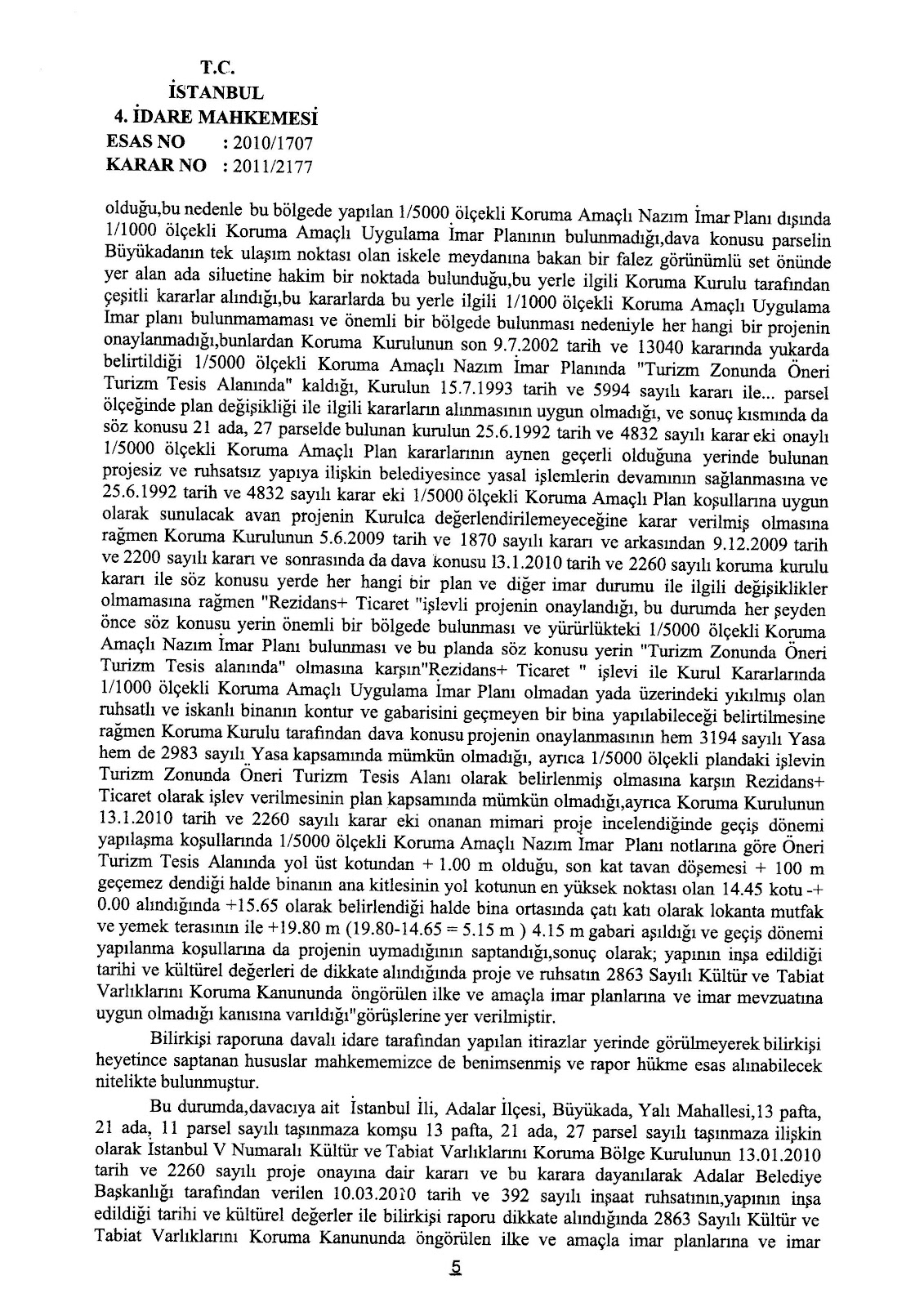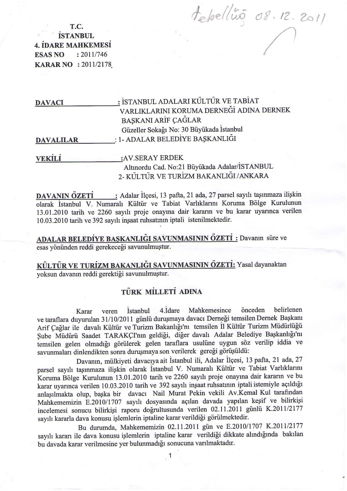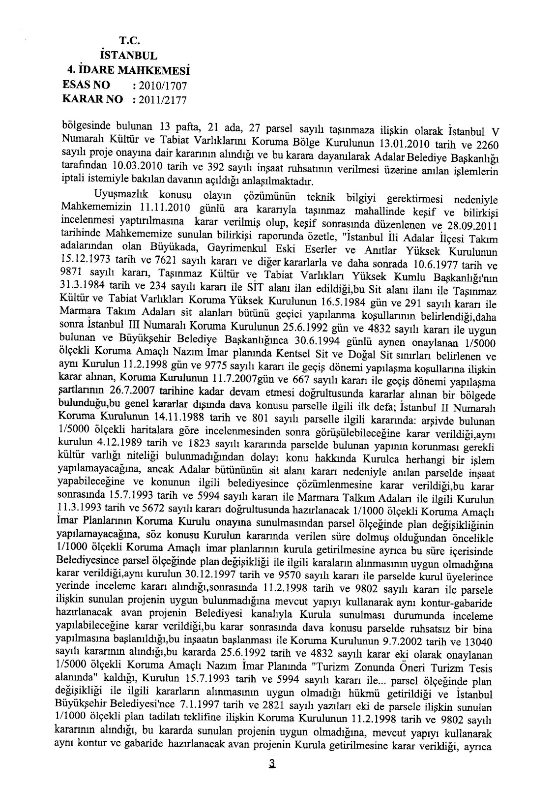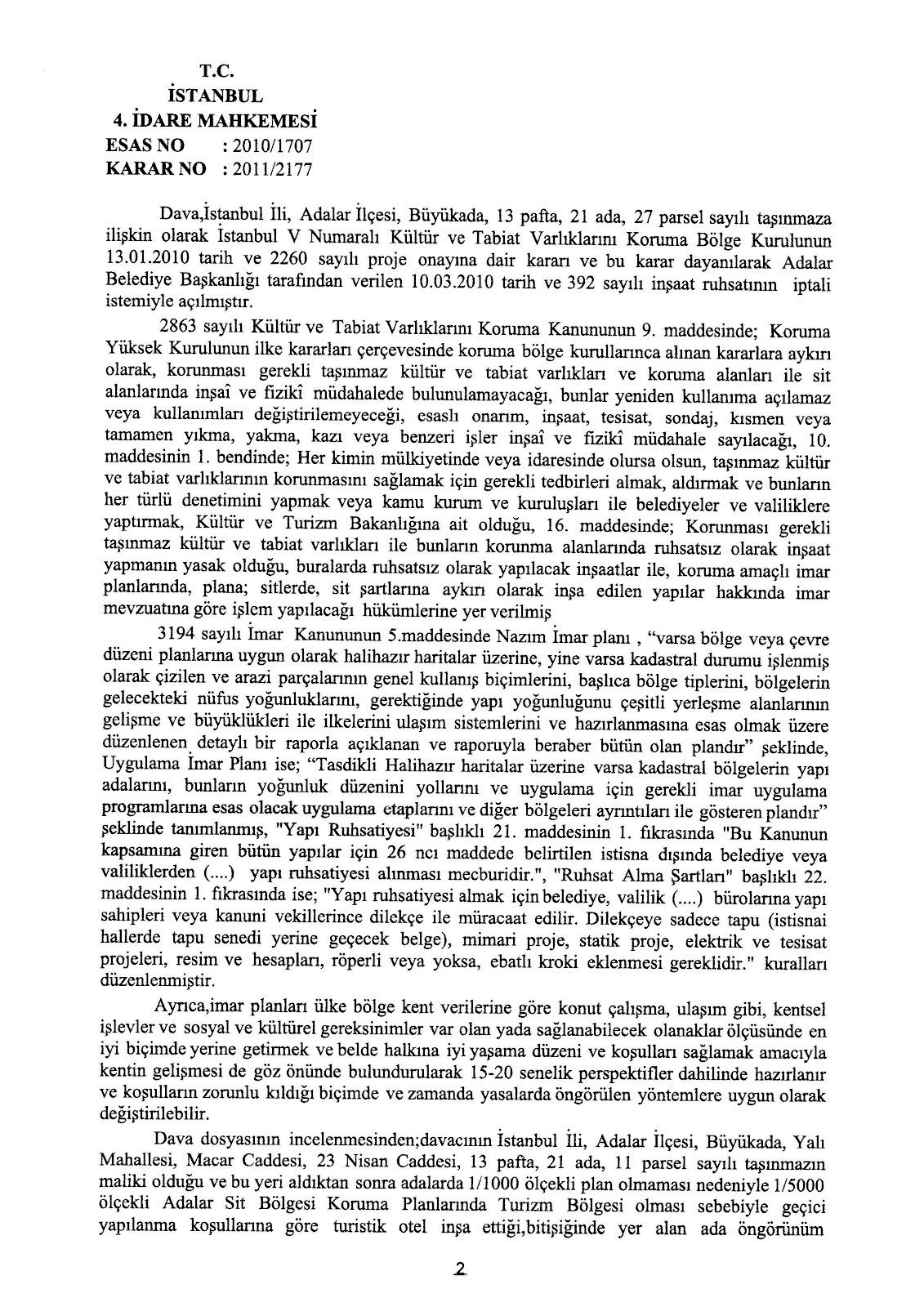 İstanbul ili, Adalar İlçesi, Büyükada Yalı Mahallesi, 13 pafta, 21 ada, 27 parsel sayılı gayri menkule ilişkin olarak İstanbul V Numaralı Koruma Bölge Kurulunun 13 Ocak 2010 tarih ve 2260 sayılı puroje onayına dair kararı ve bu karara müsteniden Adalar Belediye Başkanlığı tarafından verilen 10 Mart 2010 tarih ve 392 sayılı inşaat ruhsatı, İstanbul 4. İdare Mahkemesinin 2010/1707 Es. Ve 2011/2177 Karar sayılı 02 Kasım 2011 tarihli kararı ile iptal edilerek söz konusu yer ve müsebbibleri kanun dairesine çekilmişlerdir.