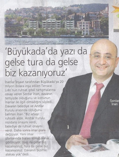 İnanlar İnşaat tarafından Büyükada’ya 20 milyon dolara inşa edilen Terrace Lido‘nun ruhsat iptali tartışmalarına cevap veren Serdar İnan, davanın temyizde olduğunu ve konunun İnanlar ile ilgili olmadığını söyledi. Davanın Belediye ve Anıtlar Kurulu arasında olduğunu belirten İnan “Biz arsayı ruhsatlı aldık. Anıtlar Kurulu rezidans onayını verdi, Belediye de ruhsat onayını verdi. Daha sonra imar planı değişiyor. Yeni imar planlarında burası konut olarak görünüyor. Yazı da gelse biz kazanıyoruz, tura da gelse biz kazanıyoruz. Davanın bizimle âlâkası yok,” dedi.