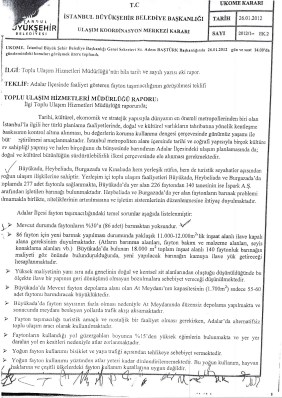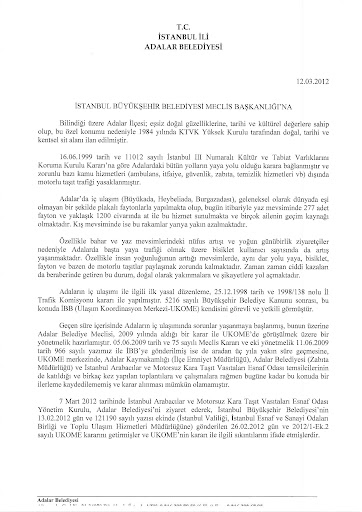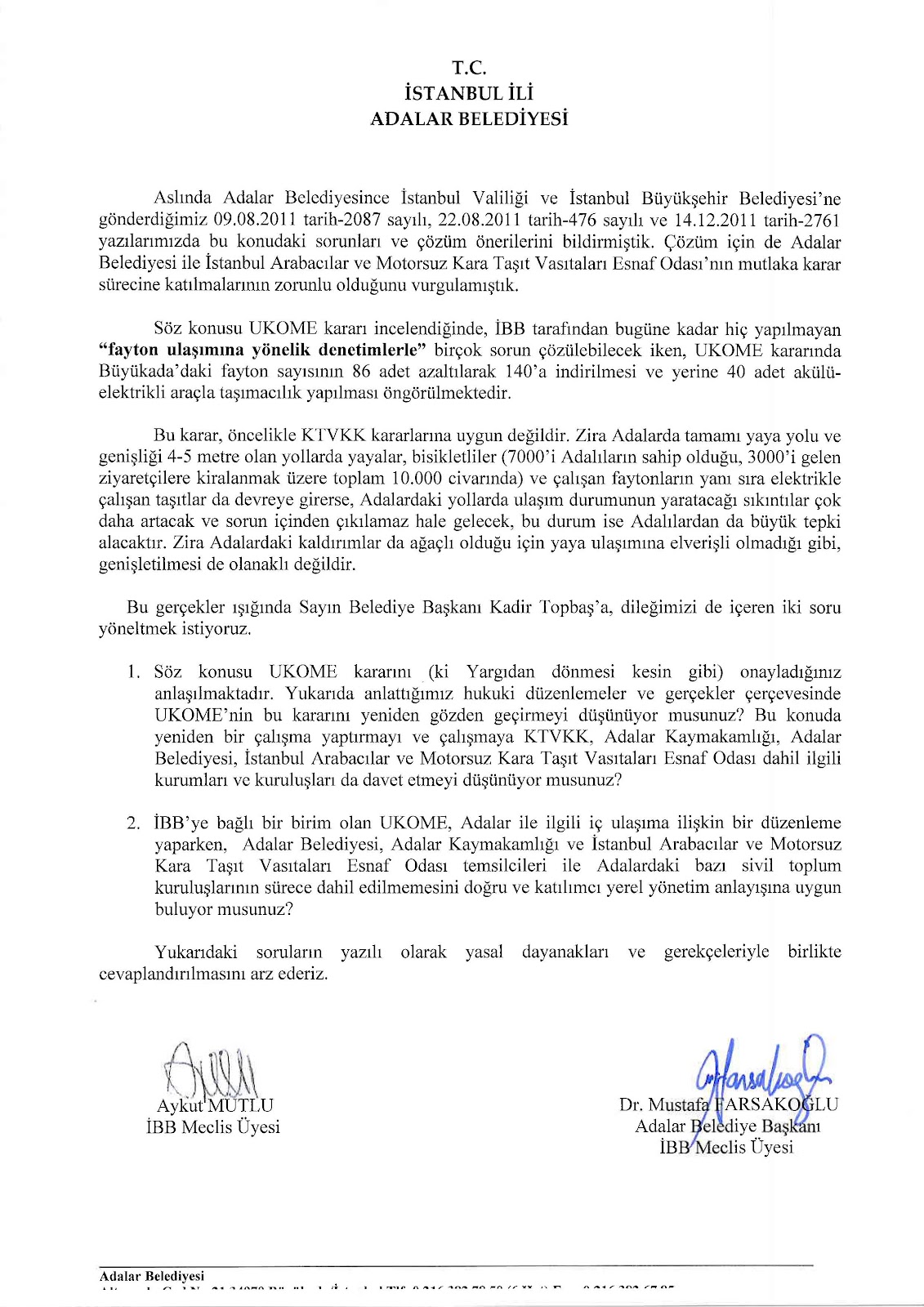 8- Adalar Belediyesi: “12 Mart 2012 tarihinde yapılan Büyükşehir Belediyesi Meclis Toplantısı’nda Belediye Başkanı Dr. Mustafa Farsakoğlu ve Meclis üyesi Aykut M. Mutlu, İstanbul Büyükşehir Belediyesi’nin 13.02.2012 gün ve 121190 sayılı UKOME kararına tepki ve eleştirilerini verdikleri soru önergesiyle dile getirdiler…”