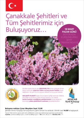 12- Ali Fuat Tolga: “18 Mart Pazar günü saat 14:00’te Büyükada Kurşunburnu Şehit Ormanı’nda, Adalar Orman Şefliği’nce, Adalar Kent Konseyi Başkanlığı’nda, Konsey’deki tüm sivil toplum temsilcilerinin katılımıyla gerçekleştirilecek olan Çanakkale Şehitleri anısına fidan dikme ve kuş yuvası asma etkinliği…”