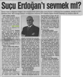 4- Adalar Belediyesi: “7 Mart 2012 tarihli Akit Gazetesi’nde ‘Suçu Erdoğan’ı Sevmek mi?’ başlığıyla bir haber yayımlanmıştır. Emre Demirel imzalı haberde Kınalıada’da Devletin hüküm ve tasarrufu altında olan kamuya ait bir kumsalda, kaçak yapı yapıp, plaj işletmesi oluşturarak, yıllarca yasa dışı gelir elde eden Derviş Bozbıyık’ın demeçlerine yer verilmiştir….”