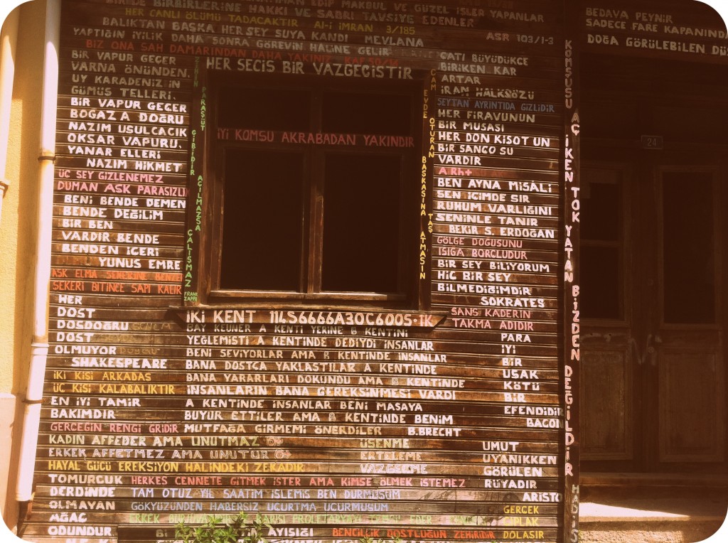 Sokaklarda avare avare yürüken karşımıza değişik bir ev çıktı. Evin duvarlarında bir sürü yazı vardı ve yazıların hepsi çok düzgün yazılmıştı. Resmen bir pano gibiydi ve fotoğrafını çekmeden edemedik. Eğer görmediysen mutlaka tanışmalısın diye düşündük. Umarım adaya gittiğinde sende evi görürsün ve hatta gelip buraya yorum yaparsın :)