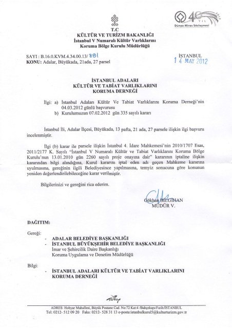 10- TC Kültür ve Turizm Bakanlığı İstanbul V Numaralı Kültür Varlıklarını Koruma Kurulu, İstanbul Adaları Kültür ve Tabiat Varlıklarını Koruma Derneği’nin 4.3.2012 tarihli başvurusu üzerine;