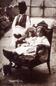 f: Şakir Paşa, Aliye Berger ile bebeği, köpeği ve de Habeşli lalası Seyfettin, Büyükada’da Şakir Paşa Köşkü’nün bahçesinde, 1909.