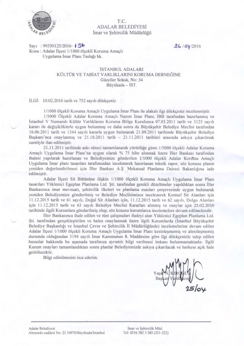 Kısacası 1/1000 ölçekli planla ilgili toplantıların ikisi de olması gerekli ve yasal zorunluluklara uygun şekilde yapılmamıştır. Özellikle tertiplenen ikinci bilgilendirme toplantısında bu yanlışlıklara birçok kişi söz alarak işaret ve itiraz etmiştir ve İAKTVKD (İstanbul Adaları Kültür ve Tabiat Varlıklarını Koruma Derneği) bu toplantıdan hemen sonra 249 sayı ve 30.11.2015 tarihli dilekçeyle, bu dilekçenin Belediye tarafından yanıtlanmaması üzerine aynı içerikle 272 sayı ve 03.02.2016 tarihli dilekçeyle incelenmesi için 1/1000 ölçekli planı ayrıntılarıyla istemiş ancak Belediye’nin 3 ay sonra verdiği zoraki yanıt olumsuz olmuştur (dilekçe ve yanıt için bu yazının EK’ine bkz.):