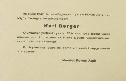“25 Eylül 1947’de bu dünyadan ayrılan büyük violonist, büyük pedagog ve büyük insan Karl Berger’i ölümünün yedinci ayında, 25 Nisan 1948 Pazar günü akşamı saat 21:00’de anmak üzere Devlet Konservatuvarı salonunda toplanacağız. Bu toplantıya sizin de şeref vermenizi saygılarımla rica ederim,” diye yazmıştı öğrencisi Necdet Remzi Atak ön yüzünde Karl Berger’in keman çalarken bir çizimi bulunan davetiyeye…