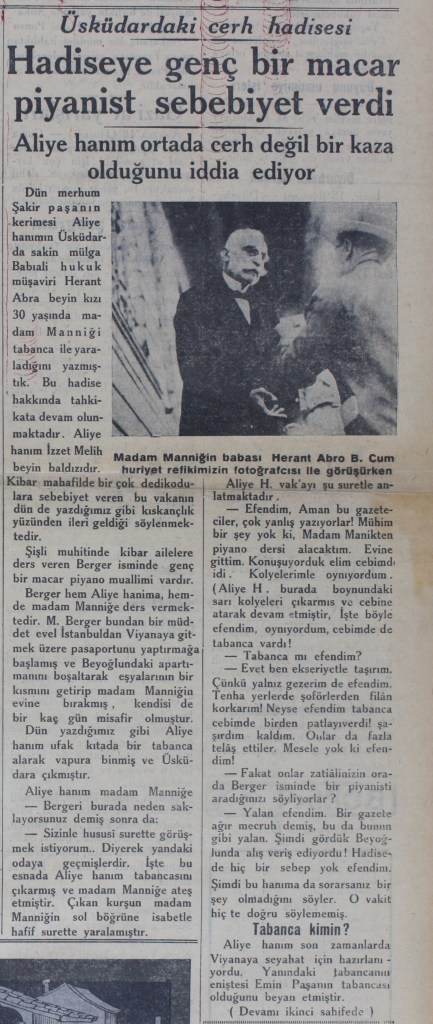Civardaki Adalılar onu yukarı, Şakir Paşa Köşkü’ne taşımışlar. Eylül sonu olduğundan, ev kış için kapatılmış durumdaymış. Ufak tefek, narin Alyoşa insanüstü bir güçle o koca demir asma kilidin zincirini eliyle koparmış. Berger’i aşağı kattaki oturma odasında sedefli divanın üstüne yatırmışlar. O akşam ailenin yakın dostu Ahmet Emin Yalman’ın eşi Rezzan Hanım haberi alır almaz köşke koşmuş. Aliye’nin yeğeni Şirin Devrim uzun yıllar sonra bir gün New York’ta ondan o gece ne olup bittiğini yazmasını rica etmiş. İşte tanık olduğu o gecenin öyküsü: