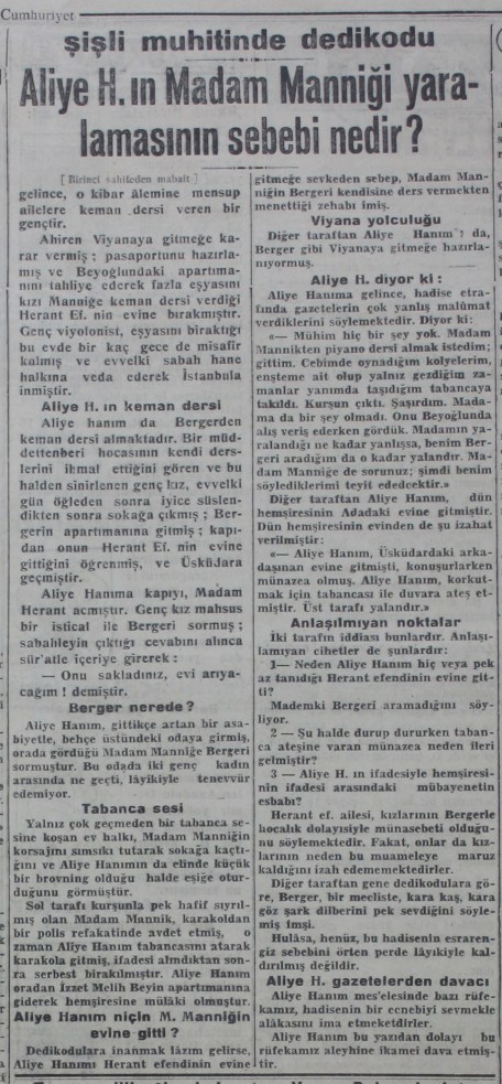 “Şişli Muhitinde Dedikodu: Aliye H. ın Madam Manniği Yaralamasının Sebebi Nedir?”, Cumhuriyet, 19.6.1929, 1,3.