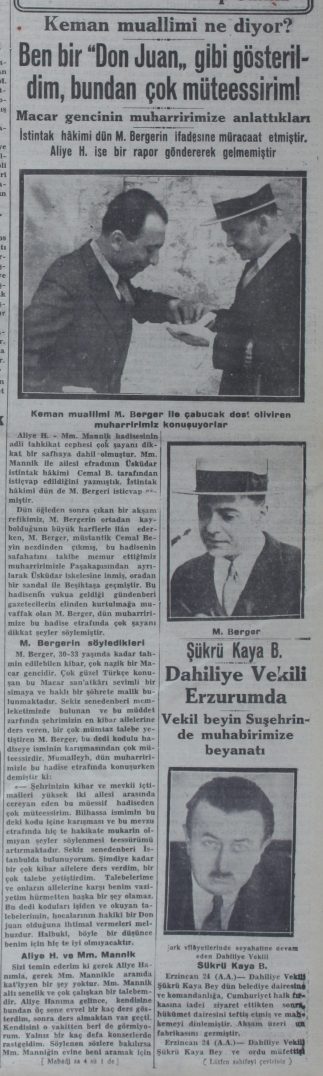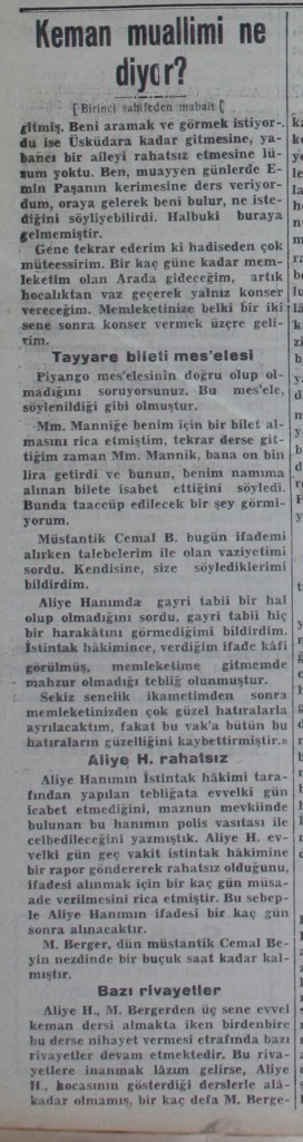 “Keman Muallimi Ne Diyor? Ben Bir ‘Don Juan’ Gibi Gösterildim, Bundan Çok Müteessirim!”, Cumhuriyet, 26.6.1929, 1, 4.