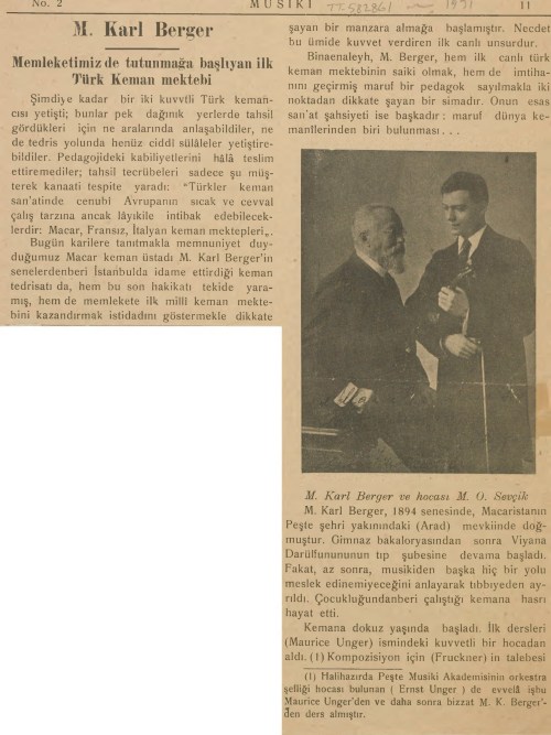 “M. Karl Berger (Memleketimizde Tutunmağa Başlayan İlk Türk Keman Mektebi)”, Dergisi No:2, ?.?.1931.