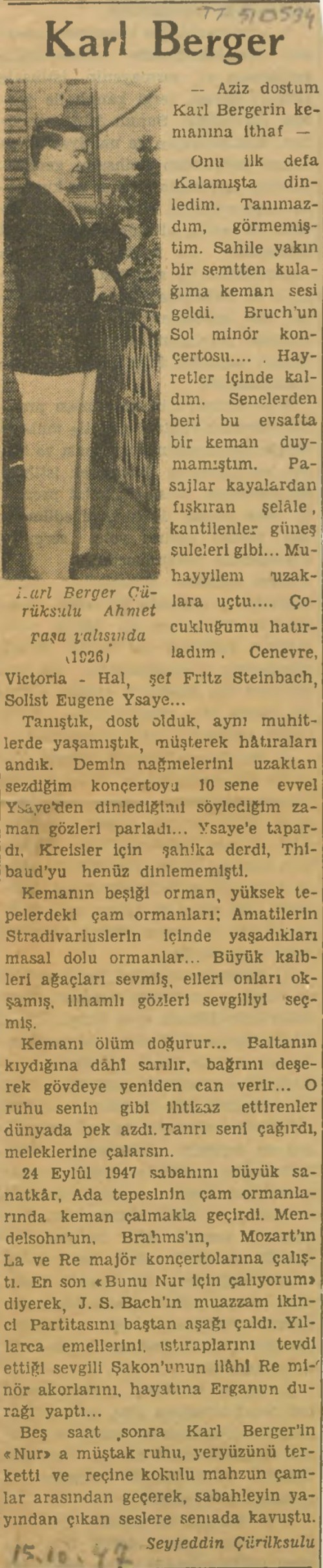 Seyfeddin Çürüksulu, “Karl Berger”, ? Gazetesi, 15.10.1947.