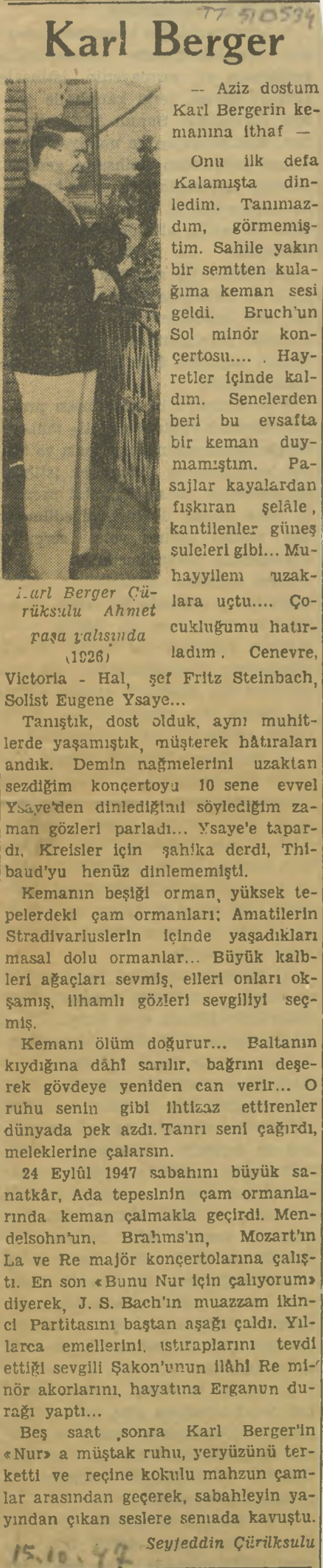Seyfeddin Çürüksulu, “Karl Berger”, ? Gazetesi, 15.10.1947.