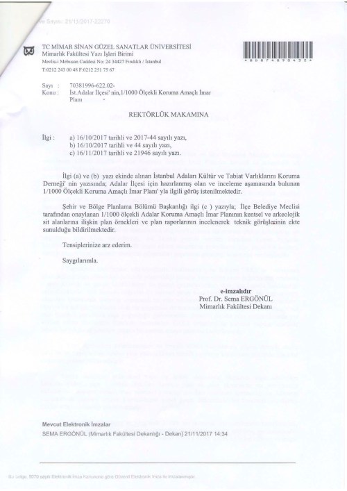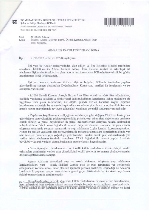 Onaya gönderilen halleri olmasa dahi 1/1000 ölçekli plan paftalarında ve plan notlarında Adalar’da inşaat hacminin en az iki katına çıkarılacağı açıkça görülmüştür ve bunun da temelinde elbette 1/5000 ölçekli plan yatmaktadır. Kısacası Adalar Belediyesi yönetimi yapacağını zaten yapmıştı, geriye sadece ÇŞB ve Koruma Kurulu onayı kalmış oluyordu. İAKTVKD bunun üzerine Koruma Kurulu’na, üniversite düzeyinde hazırlanacak bir uzman raporuyla SİT alanını tehdit eden tehlikeye dikkat çekmeyi ve Koruma Kurulu’ndan rapor doğrultusunda bu planı onaylamak yerine revize edilmesi gereğiyle Adalar Belediyesi’ne geri gönderilmesini istemiştir. Elbette düzgün uzmanların çalıştığı her üniversiteden böyle bir rapor istenebilirdi ama derneğimiz İAKTVKD tarafından, İBB’nin hazırlayıp yürürlüğe koyduğu 1/5000 ölçekli plandan önce 1994 yılında Adalar Belediyesi’nin MSGSÜ’ne hazırlatmış ve onaylanmış ve hatta 1/1000 ölçekli plan için çalışmalara bile başlamış bir üniversiteyi Koruma Kurulu’na sunulacak rapor için seçmenin doğru olacağı düşünülmüştür. Nitekim İAKTVKD böyle bir raporun hazırlanmasını bu üniversiteden istemiş ve rektörlüğün oluruyla MSGSÜ Şehir ve Bölge Planlama Bölümü Başkanı Prof. Dr. Gülşen Özaydın başkanlığında hızla çok doğru bir rapor hazırlanmış ve İAKTVKD tarafından Koruma Kurulu’na sunulmuştur. Bu raporu bu yazının ekinde okuyabilirsiniz. [Ek-2]