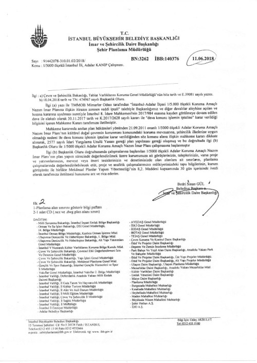 “Konuyla ilgili” gördüğü bir takım kamu kurumlarına 11.06.2018 tarihinde gönderdiği bir yazıyla İBB yeni bir 1/5000 ölçekli KANİP çalışması içinde olduğunu ilan etmiştir. Bu yazının ekinde okuyabileceğiniz yazısında İBB, SİT alanı olarak yasayla koruma altında bulunan, üstelik çok sınırlı bir ören yeri değil koskoca bir ilçenin son derece karmaşık yapısıyla ilgili, her türlü oyunun içine yerleştirildiği koskoca bir planlama hakkında bazı kamu kurumlarının yalnızca 30 gün içinde “görüş” bildirmesini istemektedir. Bu kurumların 30 günlük süreyi sadece bir 30 gün daha uzatma hakları vardır. Söz konusu planın hacmini bilenler için (bilmiyorsanız Adalar Belediyesi web sayfasından 2011 yılında yürürlüğe giren planın hacmine bakabilirsiniz) değil 30 gün, 60 gün içinde bile yeniden yapıldığı ilan edilen plan hakkında gereği gibi incelenip “görüş” bildirilemeyeceğini tahmin etmek zor değildir.