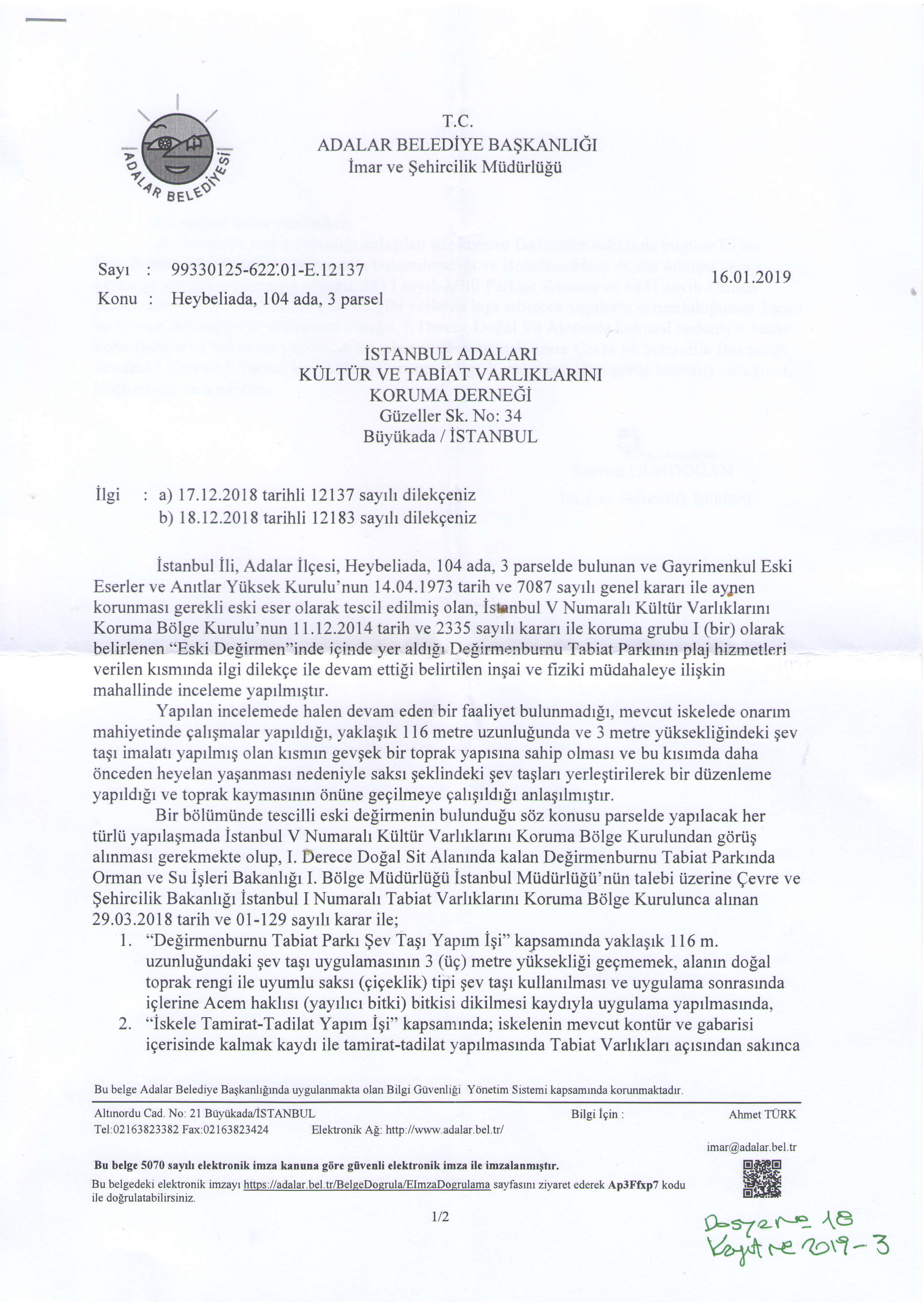 İlgili kurumlar herhalde Tarım ve Orman Bakanlığı’na bağlı Doğa Koruma ve Milli Parklar Genel Müdürlüğü, İBB İmar ve Şehircilik Daire Başkanlığı, Adalar Kaymakamlığı, Adalar Belediyesi ve nihayet İstanbul V Numaralı Koruma Bölge Kurulu ve bunun bağlı olduğu Anıtlar Yüksek Kurulu olmalıydı. Derneğimize bu kurumların hepsinden cevap gelmiştir ama Anıtlar Yüksek Kurulu’nun durumu derhal incelemesi ve açıklaması isteğiyle harekete geçen Koruma Bölge Kurumu’ndan gelen yanıt diğer kurumların hepsinden farklı olarak tatmin edici, birçok yanıyla bilgilendirici ve aynı zamanda da şaşırtıcıdır. 08.01.2019 tarihli yazının sonuç bölümü şöyledir: