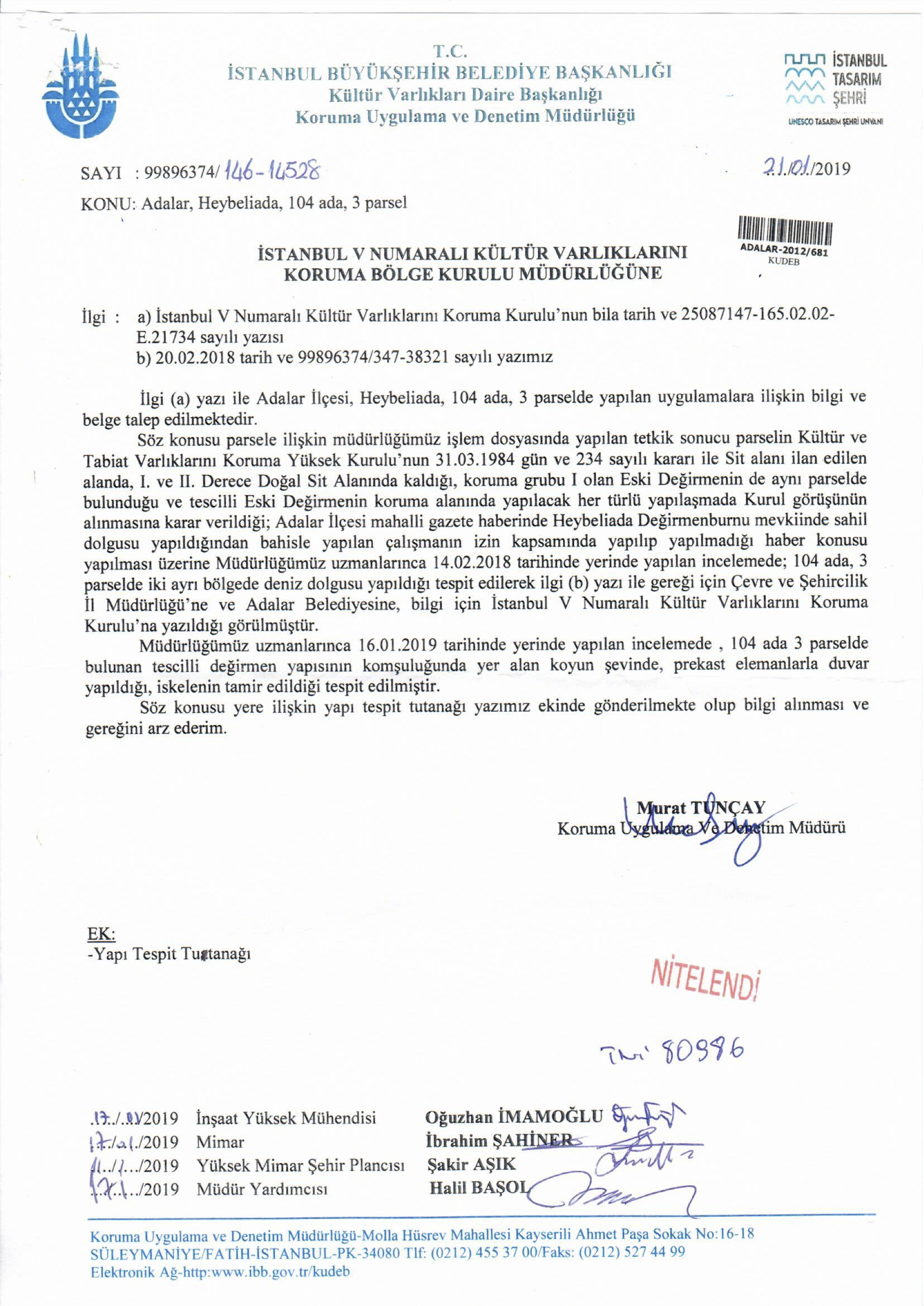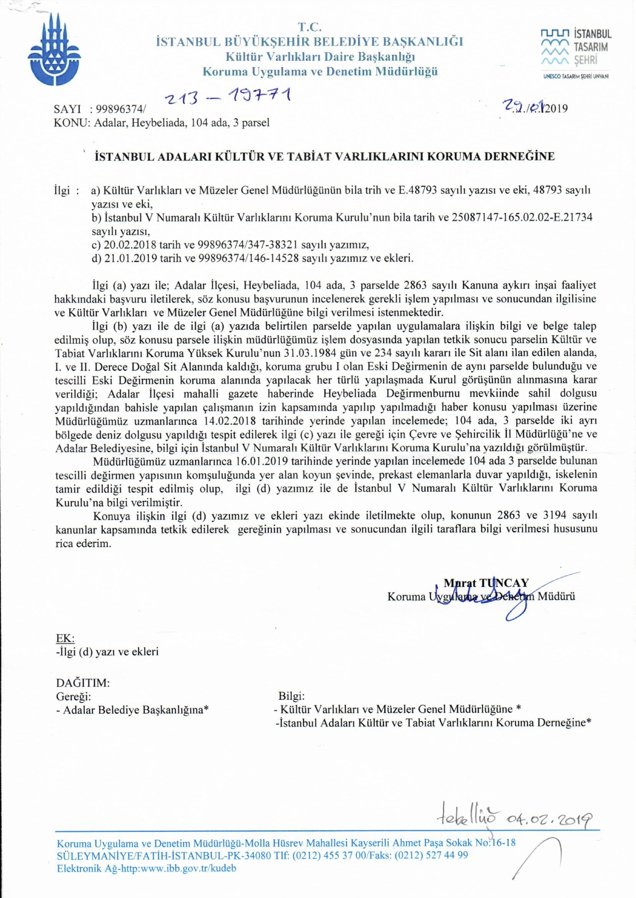 İAKTVKD’nin, İBB İmar ve Şehircilik Daire Başkanlığı’na gönderdiği dilekçeye İBB Koruma Uygulama ve Denetim Müdürlüğü’nün (KUDEB) verdiği 29.01.2019 tarihli yanıt konuyla ilgili yeni bilgiler içermektedir. KUDEP bu yazısını ve yazıya ekli raporu derneğimize olduğu gibi Koruma Bölge Kurulu’na ve Adalar Belediyesi’ne de iletmiştir, bu yazı ve raporu da yazımızın ekine koyuyoruz.