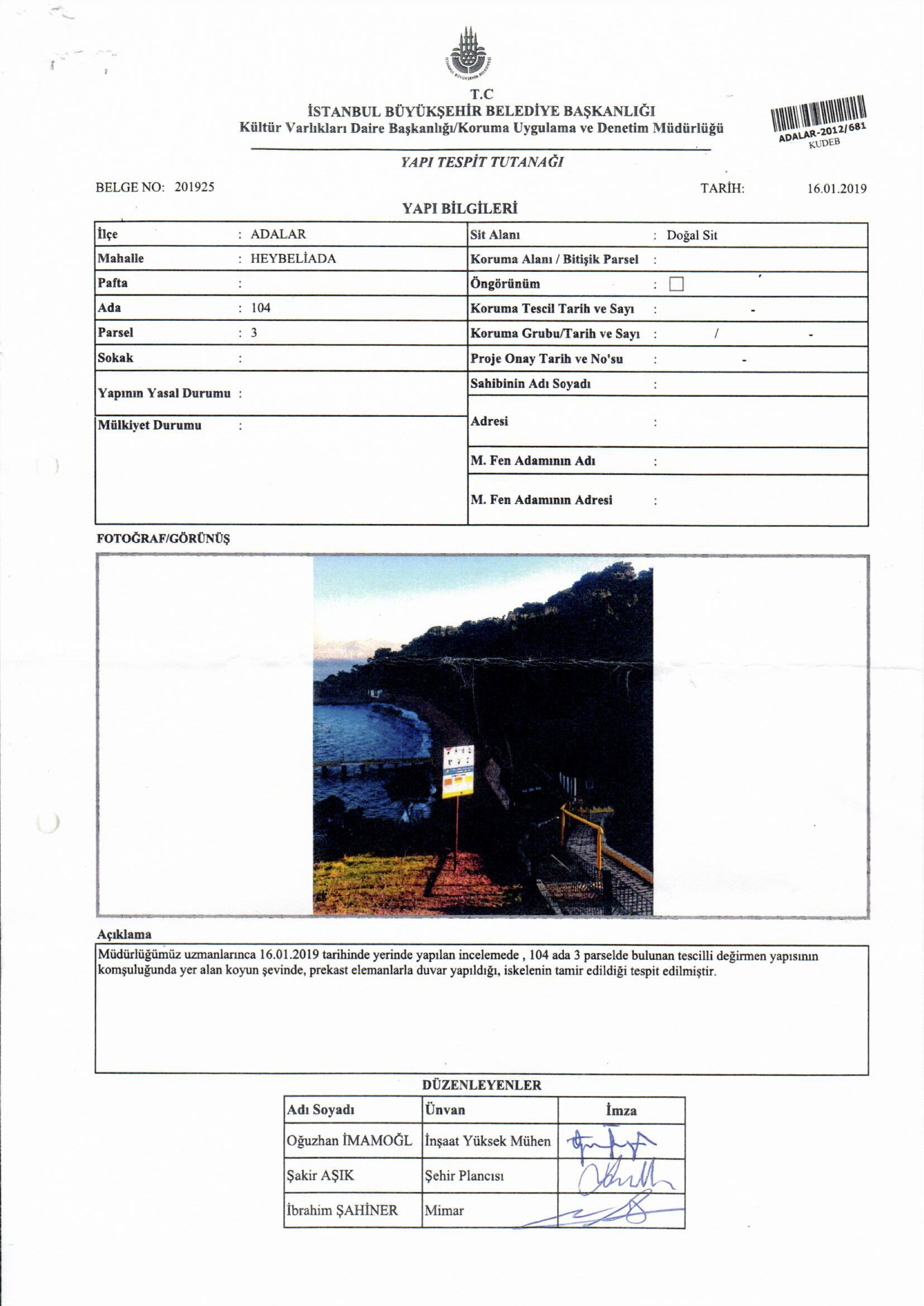 Heybeliada kıyısına yapılan inşaatla ilgili İBB İmar ve Şehircilik Daire Başkanlığı yerine İBB KUDEB raporu (29.01.2019):