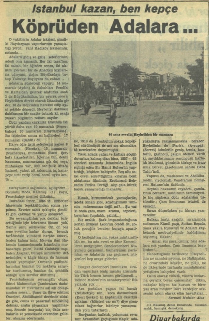 Sermet Muhtar Alus (yay. haz. Necdet Sakaoğlu), İstanbul Kazan Ben Kepçe, İstanbul (1995)217-221’de de yayımlanmış olan Sermed Muhtar Alus, “İstanbul Kazan, Ben Kepçe: Köprüden Adalara…”, Akşam, 5.3.1939. künyeli gazete kupürünü Adalar Postası’yla paylaşan Tekin Deniz’e 1001 teşekkürlerimizle…