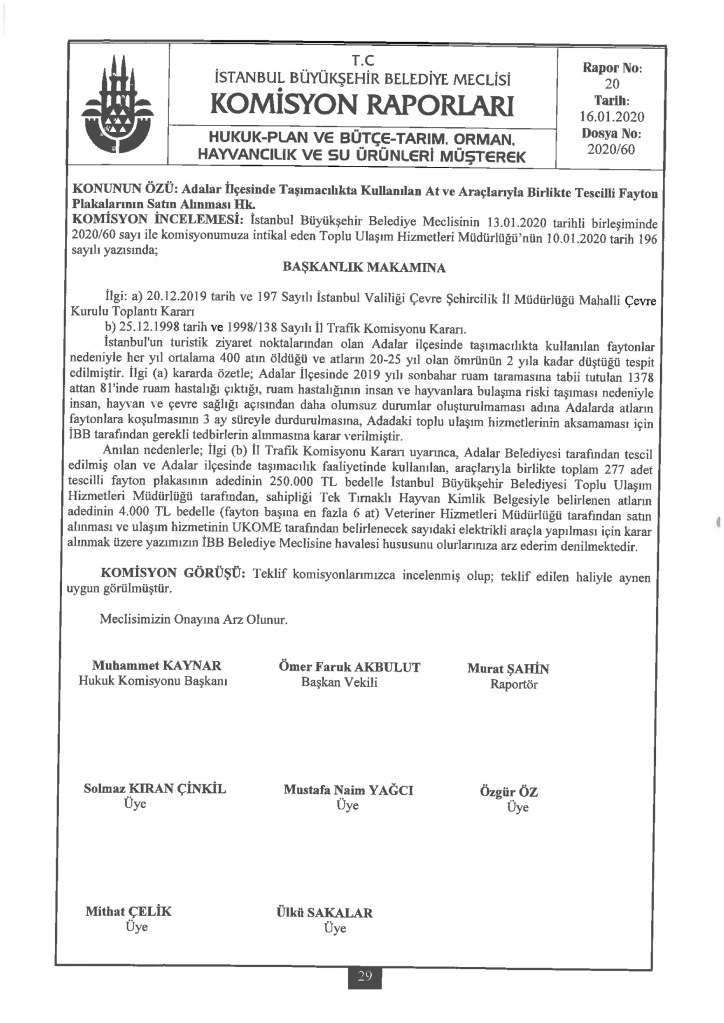 Ek-1: Adalar İlçesi’nde taşımacılıkta kullanılan at ve araçlarıyla birlikte tescilli fayton plakalarının satın alınması hakkında 16.01.2020 tarihli İBB Komisyon Raporu