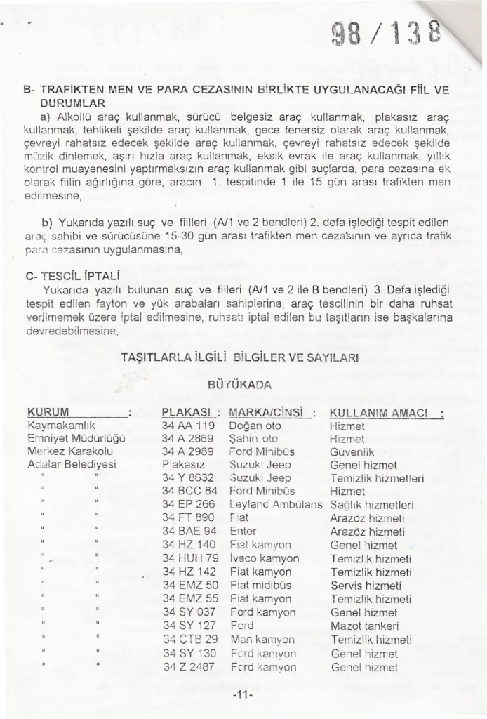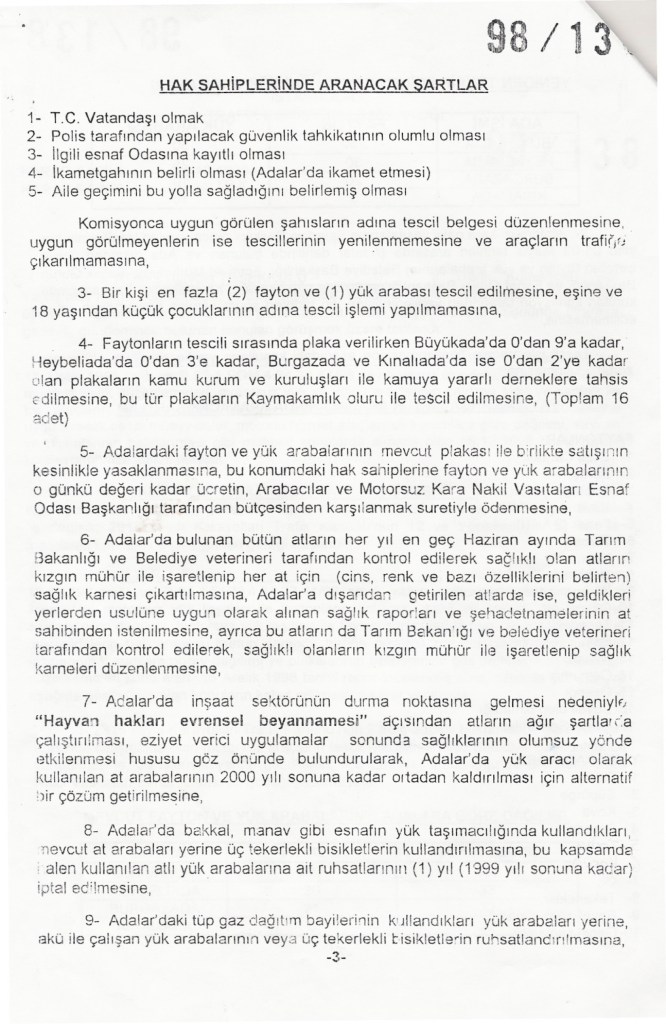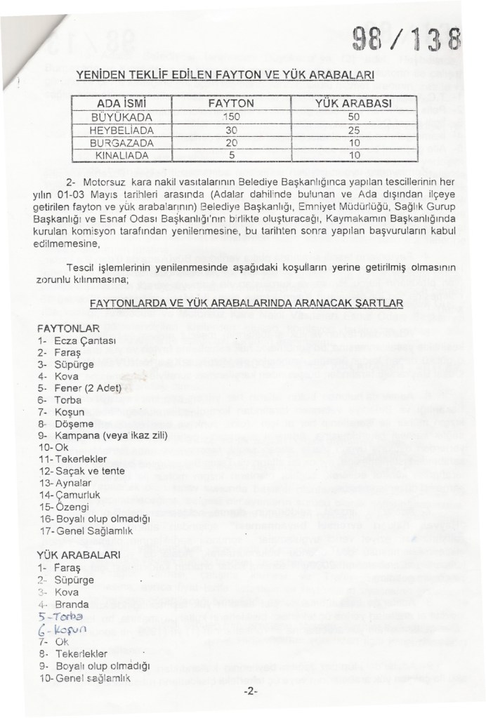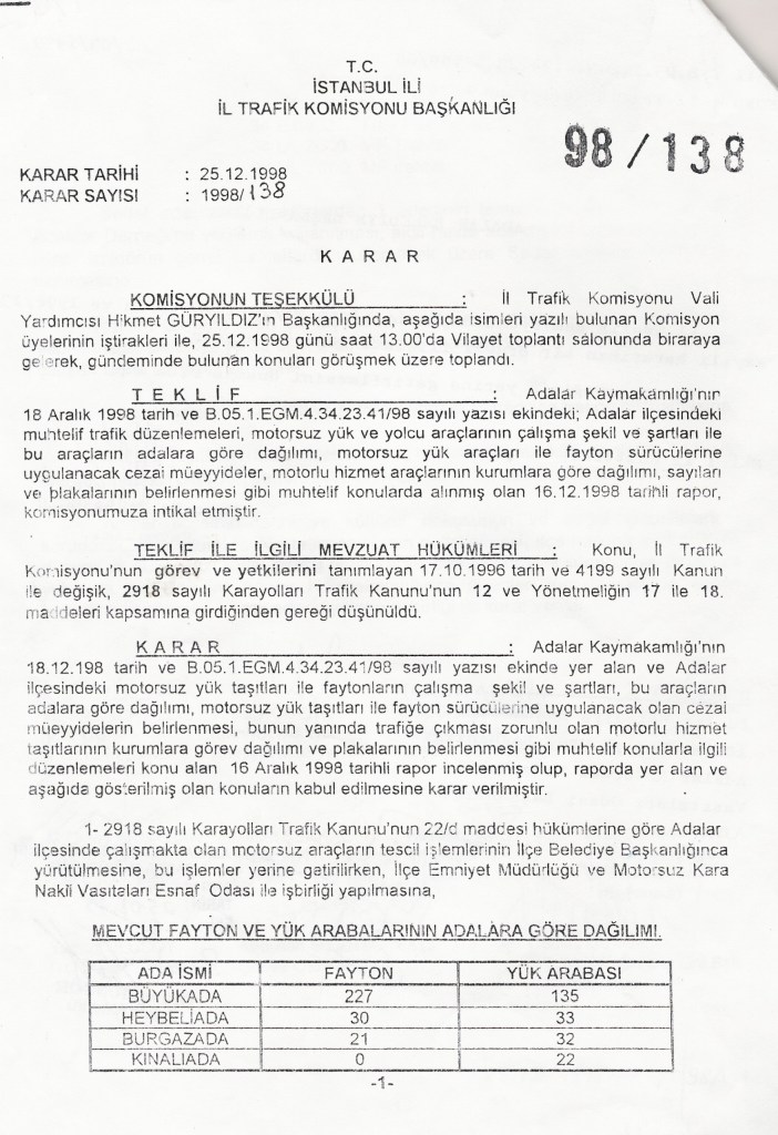 İBB Meclisi oylaması Valilik kararı yanında ikinci bir karara 25.12.1998 tarih ve 98/138 sayılı İl Trafik Komisyonu Kararına (bkz. Ek-2) işaret ediyor ki bu karar Adalar’da fayton işletmeciliğinin nasıl yapılması gerektiği (kaldırılması gerektiği değil!), at arabalarının 2000 yılına kadar tedricen azaltılarak kaldırılması önerisi (ki bu da 1995 yılında Kaymakamlık eliyle kurdurulan kamyon işletme kooperatiflerine rekabeti ortadan kaldırmak içindir! –bu önemli konuya ayrı bir yazıda ayrıca değinmek gerekiyor) ve nihayet Adalar’daki tescilli fayton sayısıyla ilgilidir. İşte bu son husus yani İBB’nin kaç tescilli fayton plakası satın alacağı meselesi bu karara aittir ve oylanan İBB kararında zikredilme sebebi de budur. İl Trafik Komisyonu Kararı’nda Adalar’dan faytonları kaldırmak kararı yoktur, fayton işletmeciliği kararı vardır.